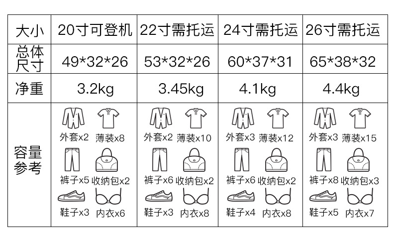 | Tamaño | 20 pulgadas más diseño de espesor [capacidad aumentada en 37 puntos 50% mayor capacidad del mismo tamaño + cremallera a prueba de explosiones de doble capa], 22 pulgadas más diseño de espesor [capacidad aumentada en 37 puntos 50% mayor capacidad del mismo tamaño + cremallera a prueba de explosiones de doble capa], 24 pulgadas más diseño de espesor [capacidad aumentada en 37 puntos 50% mayor capacidad del mismo tamaño + cremallera a prueba de explosiones de doble capa], Cargador de 26 pulgadas más diseño de espesor [37 puntos de mayor capacidad 50% de la misma capacidad + cremallera a prueba de explosiones de doble capa] |