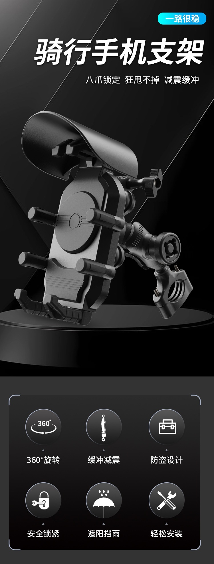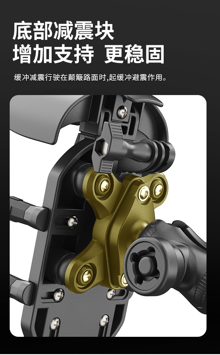 【5】骑行减震手机支架采用加厚护垫,机械锁紧设计,八爪软胶套保护,有效缓冲减震