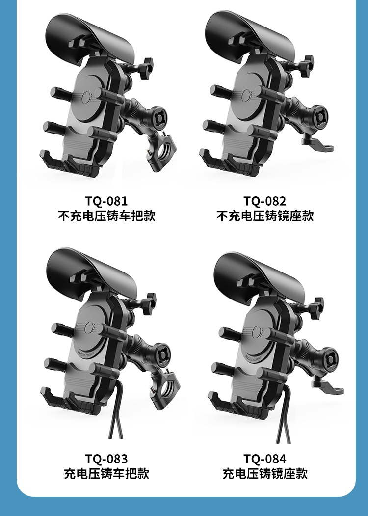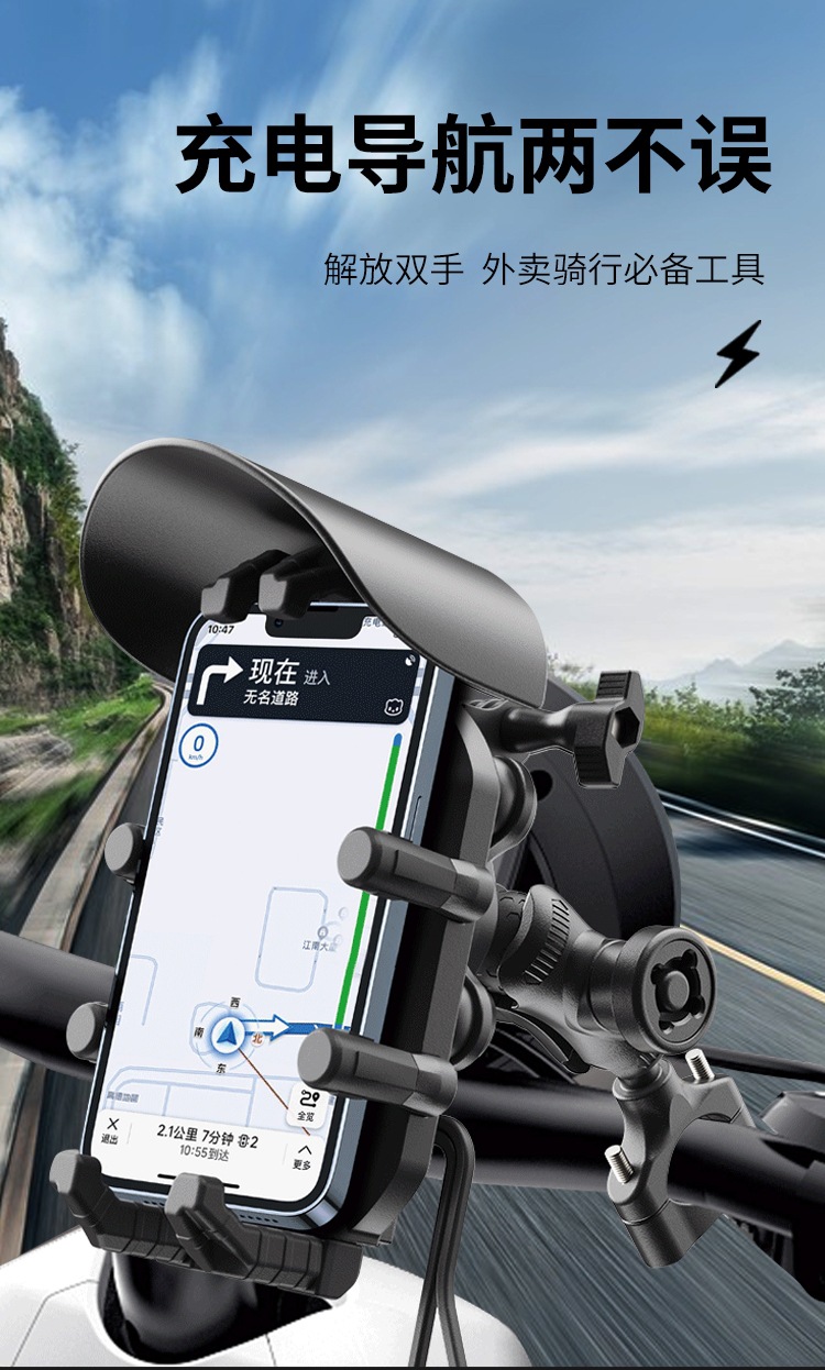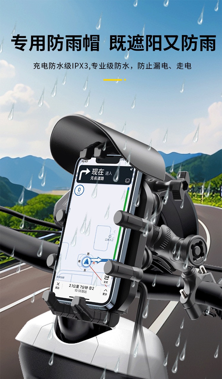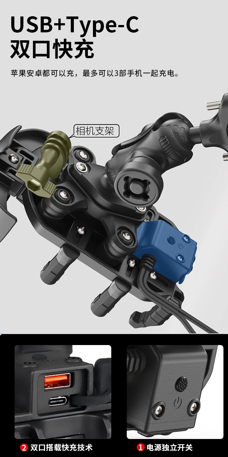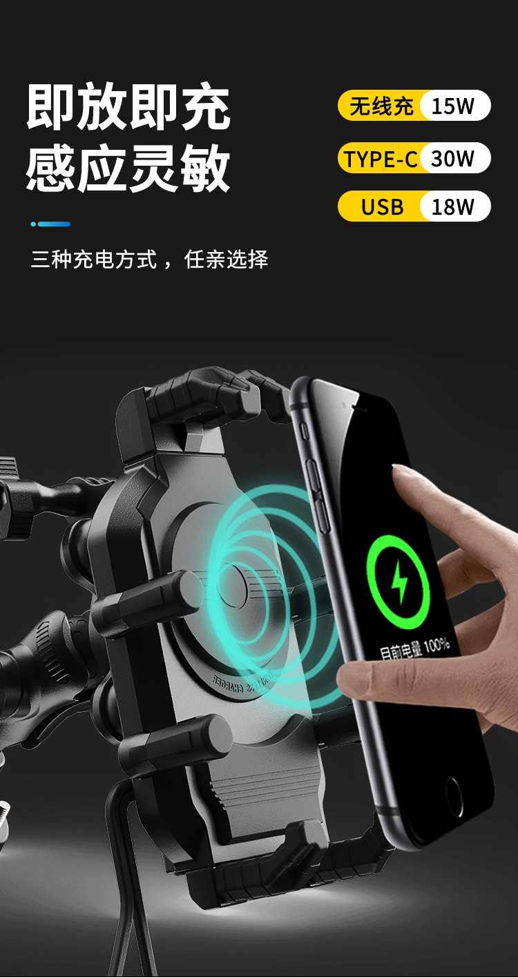 【1】摩托车充电支架支持USB、无线、TYPE-C三种方式充电,可分别进行高效快速的充电