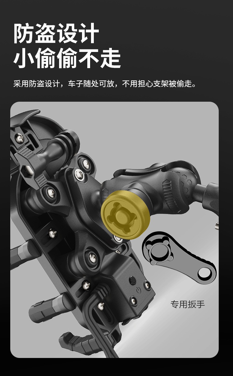 【3】摩托车载导航仪支架配备专属了防盗钥匙,拧紧螺丝后可以调整角度,不能拆卸支架