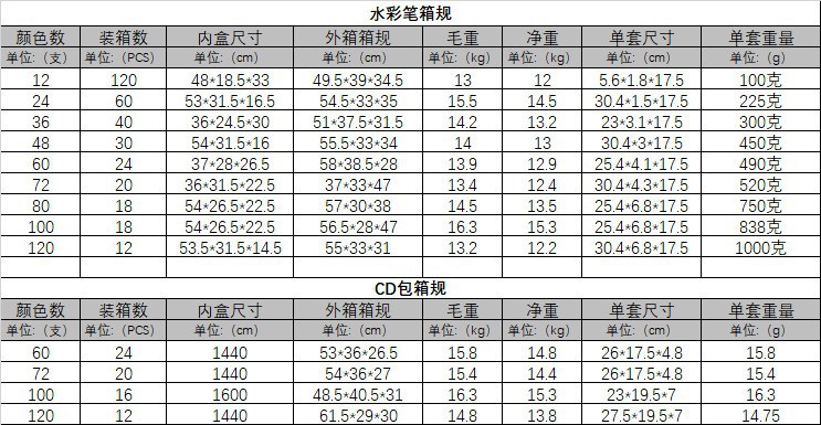 | Color | 12 colores, 24 colores, 36 colores, 48 colores, 60 colores, 80 colores, 100 colores, 120 colores, 12 colores, 24 colores, 36 colores, 48 colores, 60 colores, 80 colores, 100 colores, 120 colores, 72 colores, 72 colores, 72 colores |
