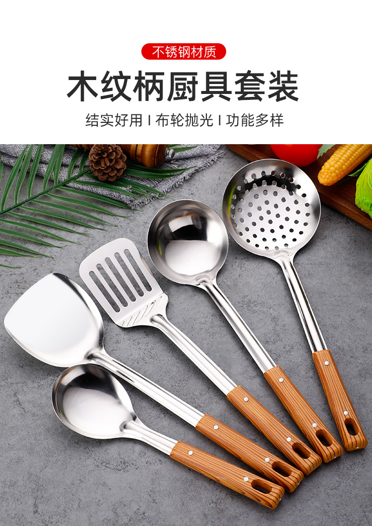 Utensilios de cocina, anti-quemaduras, imitación de grano de madera, acero inoxidable grueso, espátula, colador grande, espátula para freír, juego de utensilios de cocina diarios