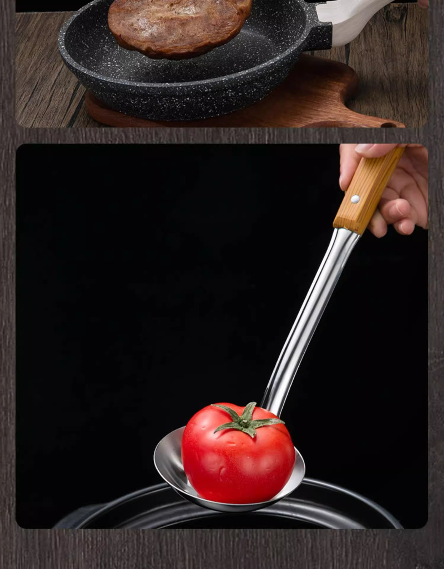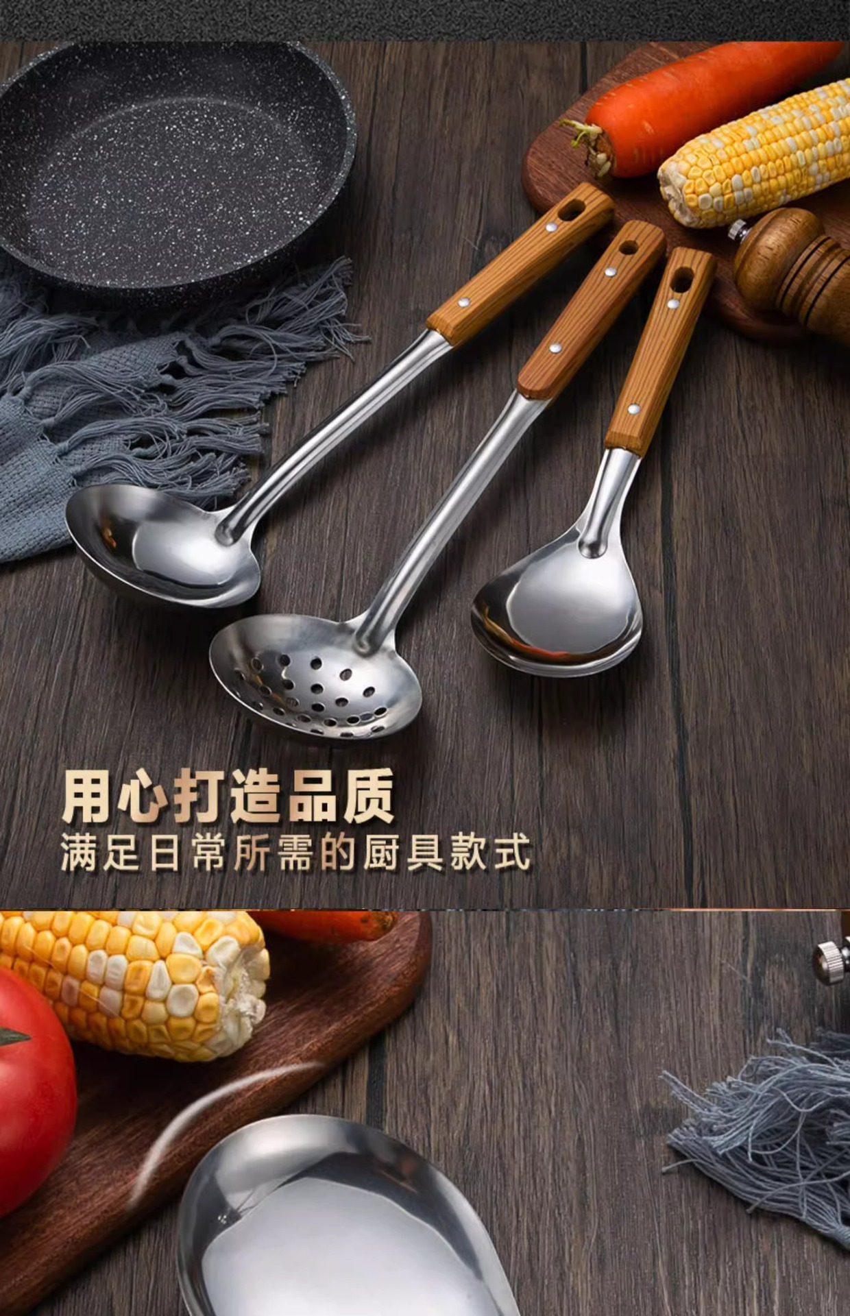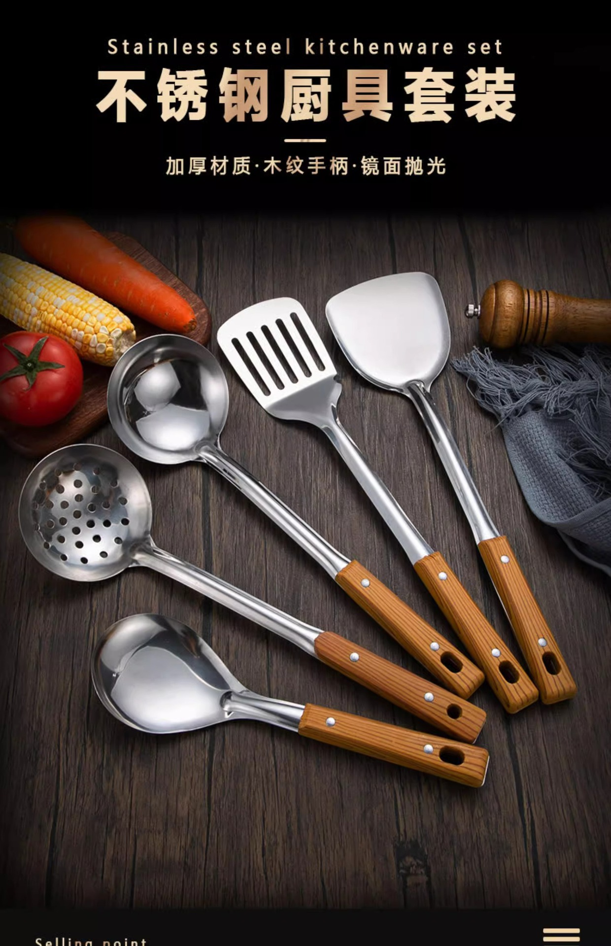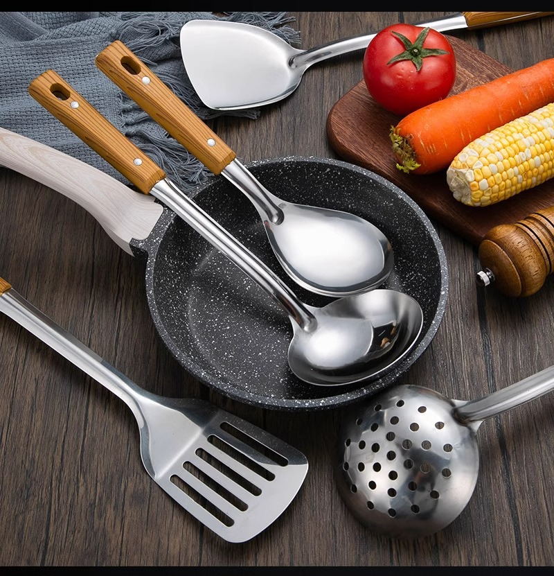 Mango anti-escaldado de acero inoxidable, espátula, colador, juego de utensilios de cocina de grano de madera de imitación, cocina, cocina, cocina, cocina, espátula, espátula