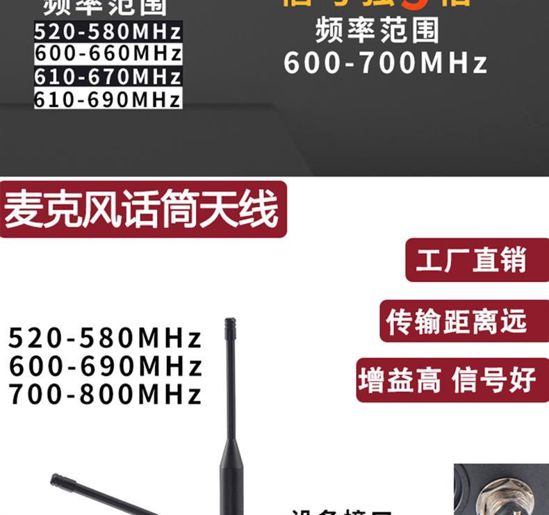 | Especificaciones del producto | 1 antena de ganancia de micrófono de diversidad verdadera (35CM de largo. interfaz BNC), 1 antena de ganancia de micrófono de diversidad verdadera (interfaz BNC. 30CM de largo), 1 antena de diversidad verdadera (interfaz BNC. 27CM de largo), 1 antena de ganancia de micrófono KTV (interfaz BNC. 26CM de largo), 1 antena de micrófono de sección U (640 - 690MHz de largo), 1 antena de micrófono de sección U (600 - 660MHz de largo), 1 antena de 520MHz - 580MHz de largo (interfaz BNC)) |