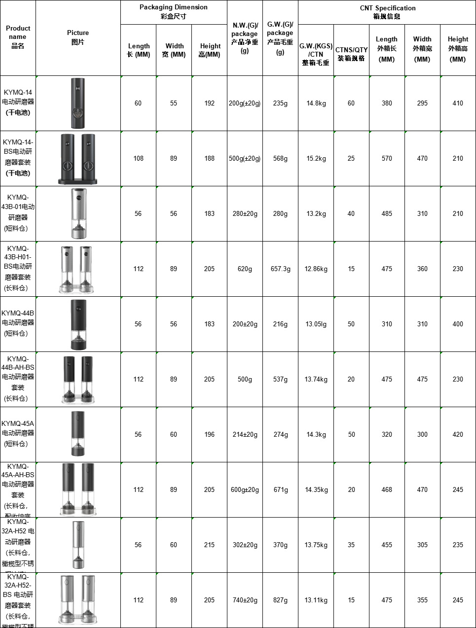 | Especificaciones | [Modelo de batería] Molinillo eléctrico KYMQ-14,[Modelo de batería] Juego de abrasivos eléctricos KYMQ-14-BS (con base de almacenamiento),[Modelo de batería] Molinillo eléctrico KYMQ-44B (silo corto),[Modelo de batería] Juego de abrasivos eléctricos KYMQ-44B-AH-BS (silo largo con base de almacenamiento),[Modelo de batería] Molinillo eléctrico KYMQ-43B (silo corto),[Modelo de batería] Juego de abrasivos eléctricos KYMQ-43B-BS (silo largo con base de almacenamiento),[Carga] Molinillo eléctrico KYMQ-45A (silo corto),[Carga] Juego de abrasivos eléctricos KYMQ-45A-AH-BS (silo largo con base de almacenamiento),[Carga] Molinillo eléctrico KYMQ-32A-H52,[Carga] Juego de molinillo eléctrico KYMQ-32A-H52-BS (silo largo, botón de acero inoxidable en forma de aceituna, con base de almacenamiento) |
