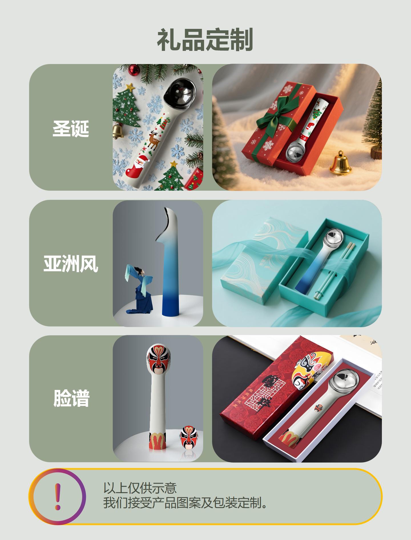 设计理念: 产品遵循“less is more”的工业设计理念,勺身线条简洁,配备科技感的温度、电量屏显,以及触握式的启动方式和自动断电的安全防护功能。