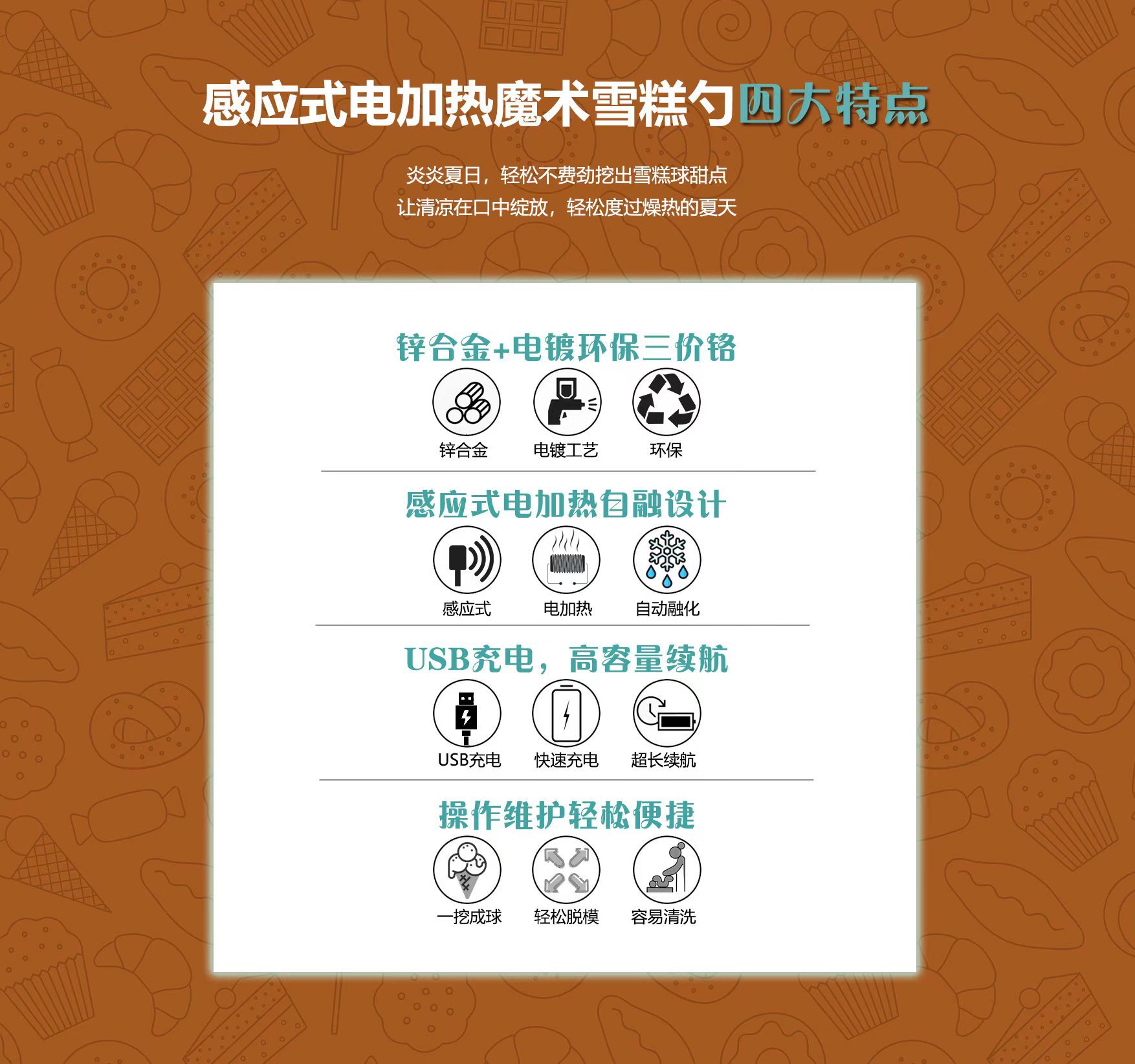 安全性与耐用性: 加热雪糕勺具备防水IP67功能,支持多次充电,勺身采用FDA验证食品级材料,勺头采用食品级亮面锌合金材质,易于清洗且耐用。