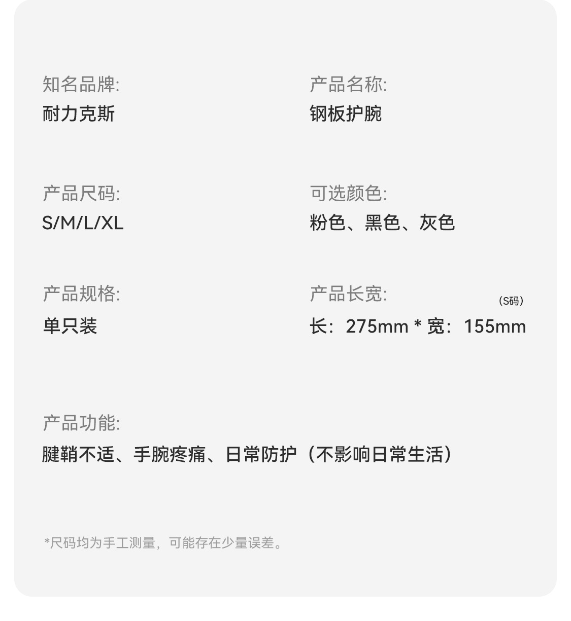| Especificaciones | Mano derecha rosa transpirable [Soporte de acero de plástico + transpiración delgada ligera], mano izquierda rosa transpirable [Soporte de acero de plástico + transpiración delgada ligera], mano derecha negra transpirable [Soporte de acero de plástico + transpiración delgada ligera], mano izquierda negra transpirable [Soporte de acero de plástico + transpiración delgada ligera], mano derecha gris transpirable [Soporte de acero de plástico + transpiración delgada ligera], mano izquierda gris transpirable [Soporte de acero de plástico + transpiración delgada ligera] |