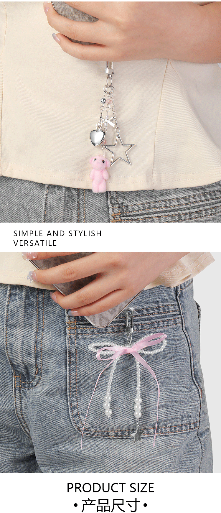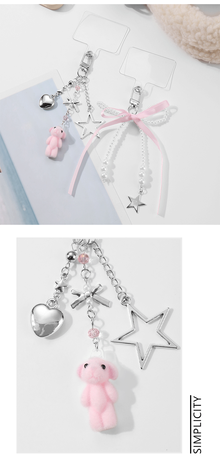 1 llavero colgante de arco de perla de correa rosa, 1 llavero colgante de oso de flojo de cadena plateada, 1 junta de teléfono celular blanca
