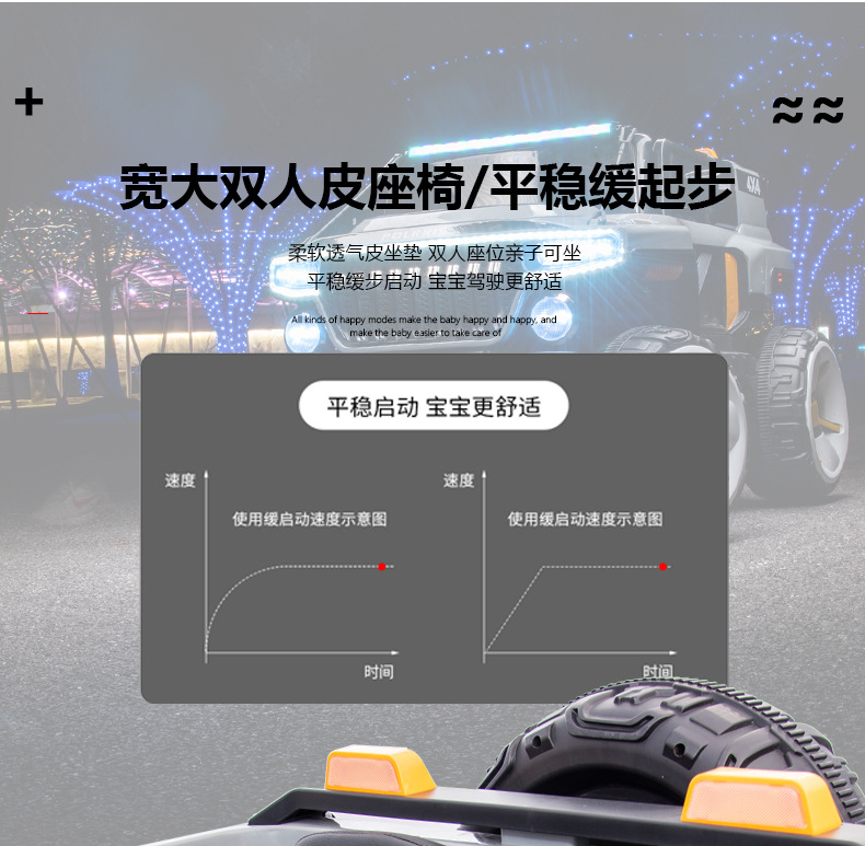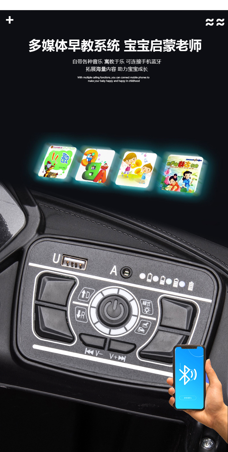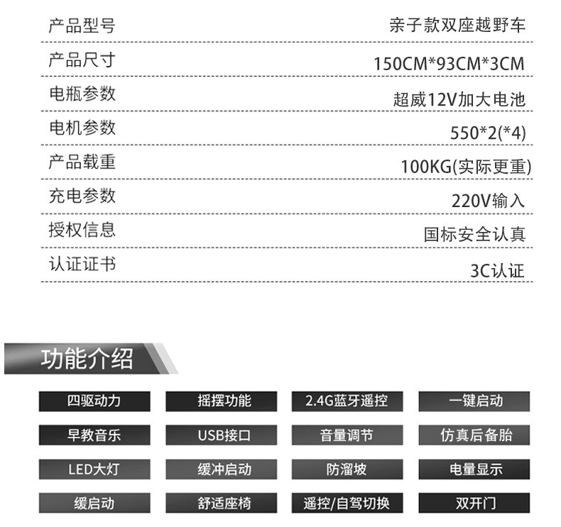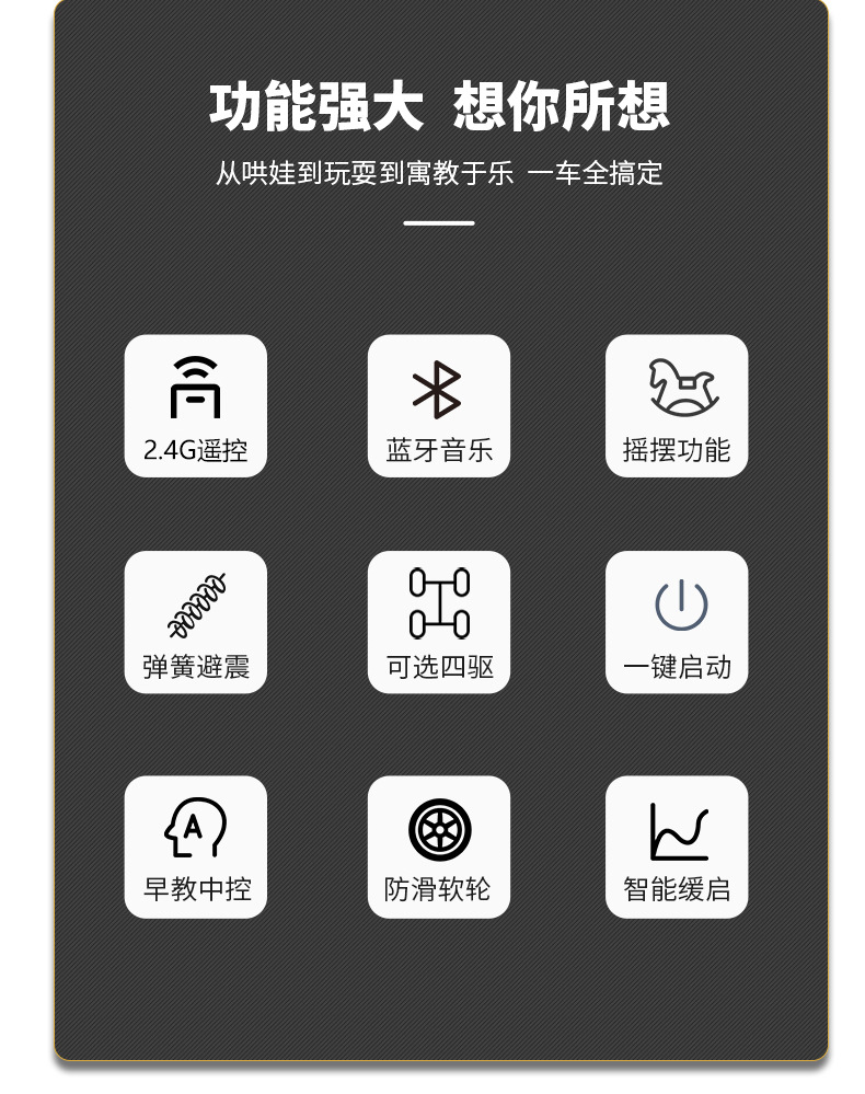 双座空间,双开门,碳钢结构,蓝牙早教一体中控,炫彩灯光,usb+mp3接口,摇摆功能,蓝牙遥控,手机遥控,全尺寸备胎