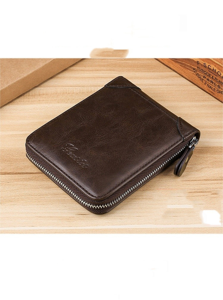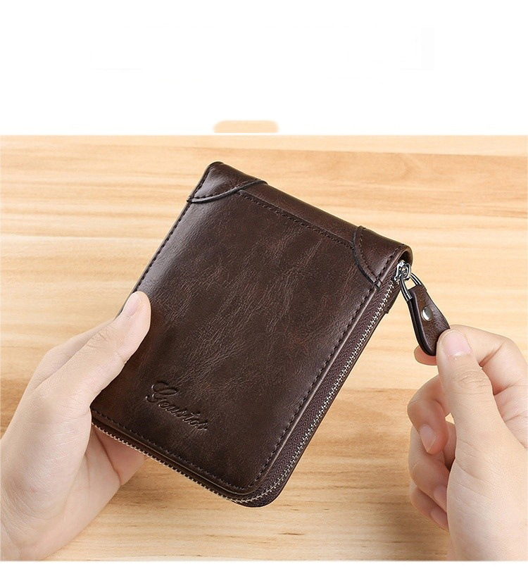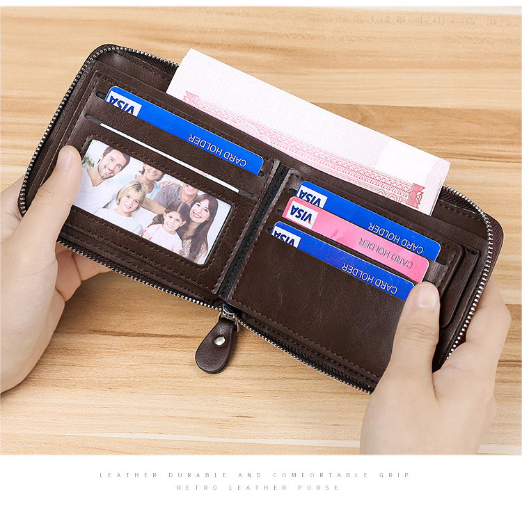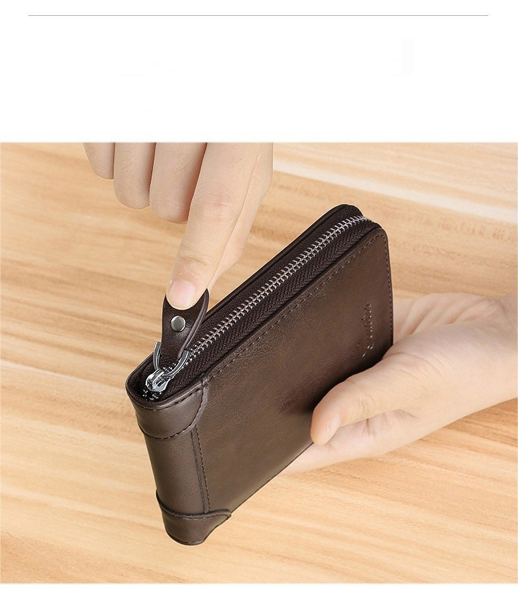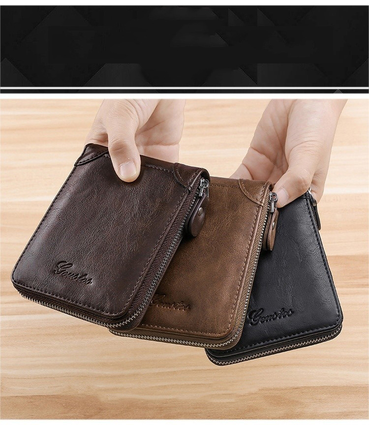 Cartera de cuero corta multifuncional con cremallera de cuero de vaca de gran capacidad anti-robo cartera de tarjeta deslizante para hombres
