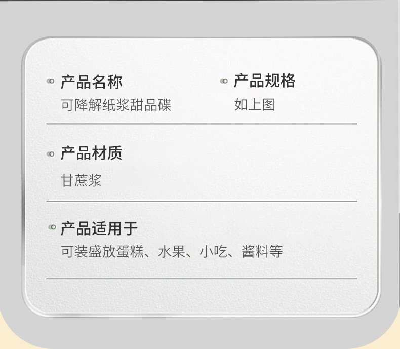 | Colores | Disco pequeño de 3 pulgadas,Disco cuadrado pequeño de 4 pulgadas,Disco rectangular con mango,Plato para mojar en forma de huevo,Plato de inmersión en forma de hoja,Plato para mojar en forma de limón,Plato de inmersión en forma de gota,Plato de inmersión cuadrado,Plato de inmersión en forma de olla poco profunda,Plato de inmersión en forma de olla profunda,Plato de inmersión súper grueso desechable de cáscara de arroz,Plato de inmersión de cáscara de arroz blanco súper grueso desechable,Tenedor y cuchara independientes de 11.5cm |