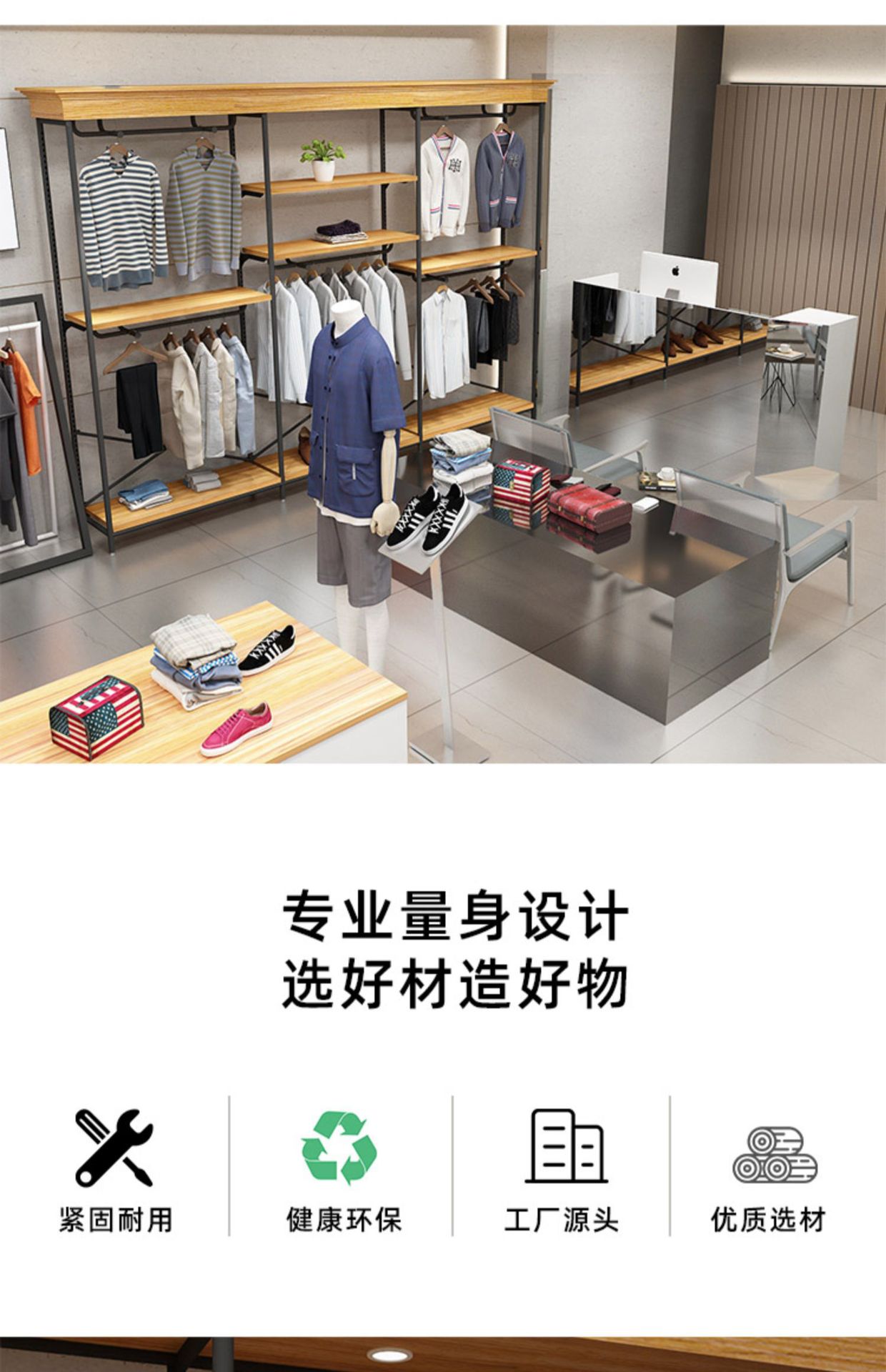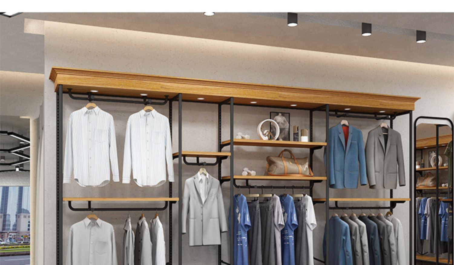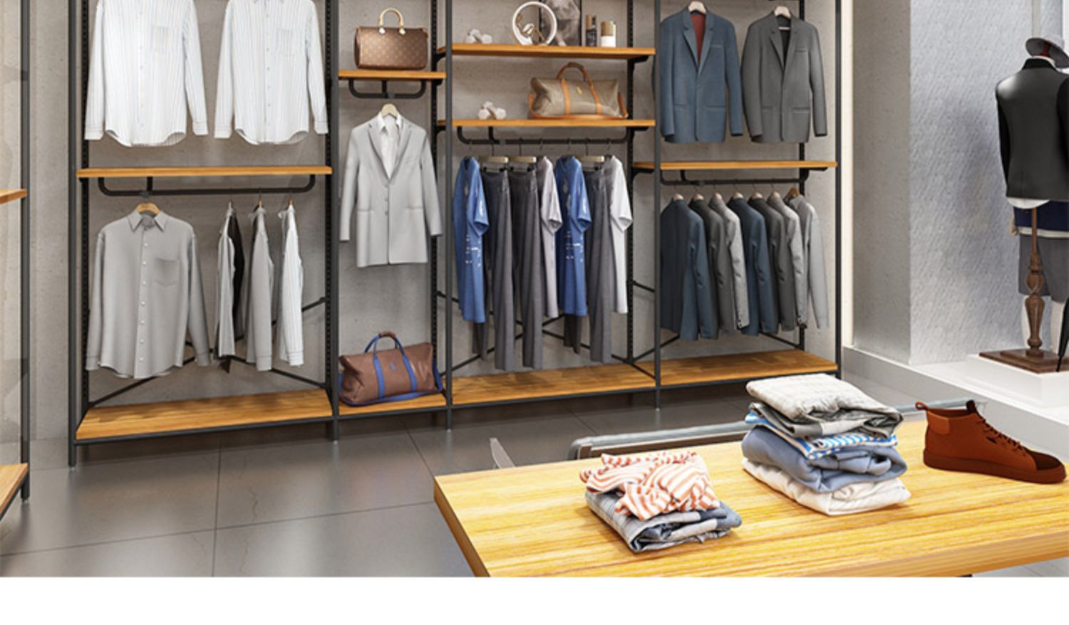 Tienda de ropa soporte de exhibición tipo piso percha de madera maciza montado en la pared estante de la isla con luces pantalones estante de exhibición estante de los hombres
