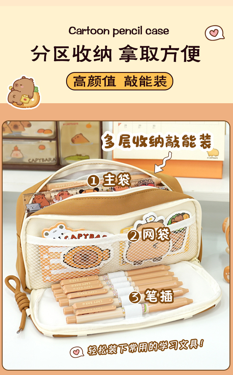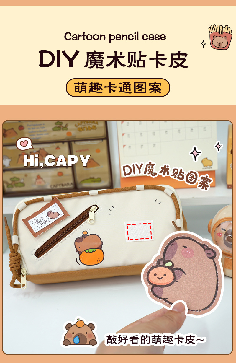 Cute Kapibalah, bolsa de papelería con cordón de gran capacidad de múltiples capas, bolsa de lápices de almacenamiento para estudiantes de primaria y secundaria, caja de papelería con velcro