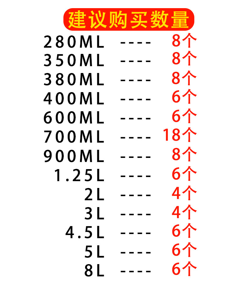 | Modelo de especificación | 280ml nueva botella cuadrada,350ml nueva botella cuadrada (0,7 kg de agua),Botella cuadrada de 400ML (0,8 kg de agua),Botella cuadrada de 600ML (1,2 kg de agua),700ml nueva botella cuadrada (1,4 kg de agua),Nueva botella cuadrada de 900ml (1,8 kg de agua),Botella cuadrada 900ML (1,8 kg de agua),1.25L botella cuadrada (2,5 kg de agua),1.25L nueva botella cuadrada (2,5 kg de agua),Botella cuadrada de 1.3L (2,6 kg de agua),Botella cuadrada de 1.5L (3 kg de agua),Botella cuadrada de 1.5L (3 kg de agua),Botella cuadrada de 2L (3,6 kg de agua),Botella cuadrada 3L (6 kg de agua),Botella cuadrada de 4.5L (9 kg de agua),Botella cuadrada de 5L (10 kg de agua),Botella cuadrada 6L (12 kg de agua),Botella cuadrada 8L (16 kg de agua),1.8L botella de calabaza |
