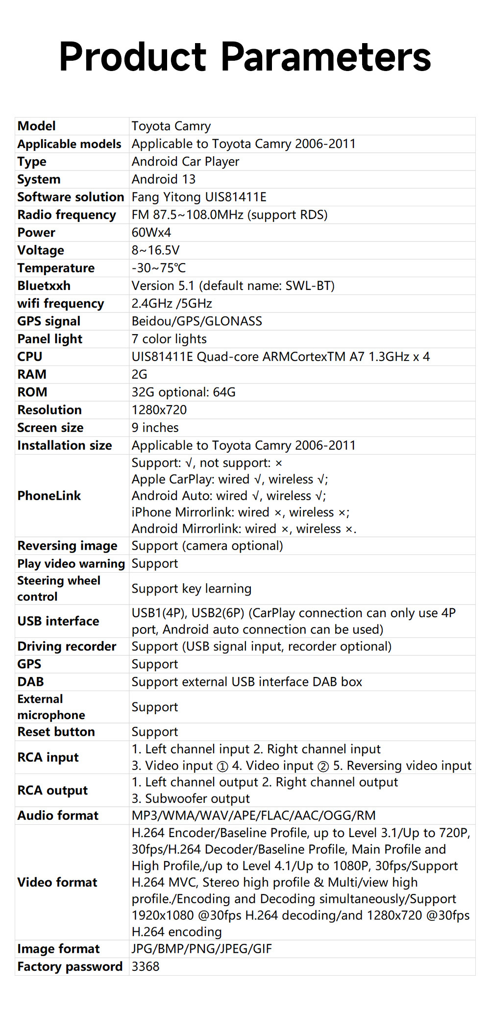 | Especificaciones | Aplicable a 06 ~ 11 Toyota Camry |