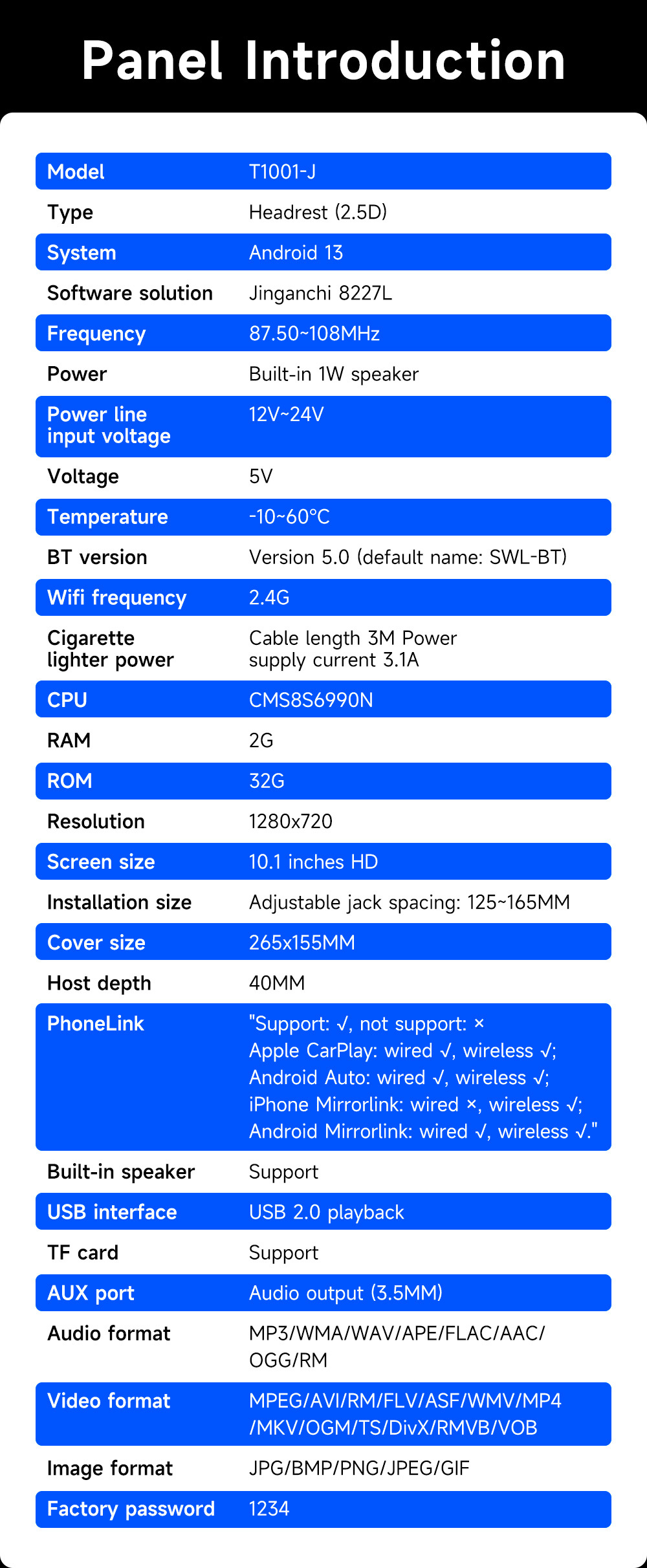 | Especificaciones | T1001 - J [Jing Anchi 2 + 64G] |