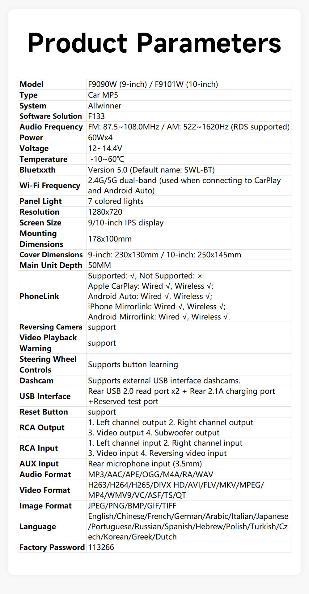 | Especificaciones | [9 pulgadas] F9090W, [10 pulgadas] F9101W |