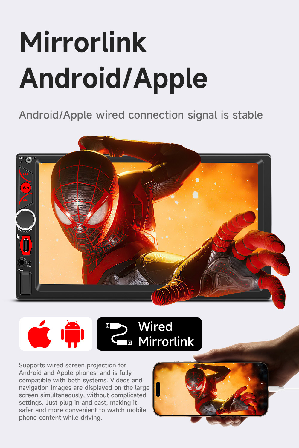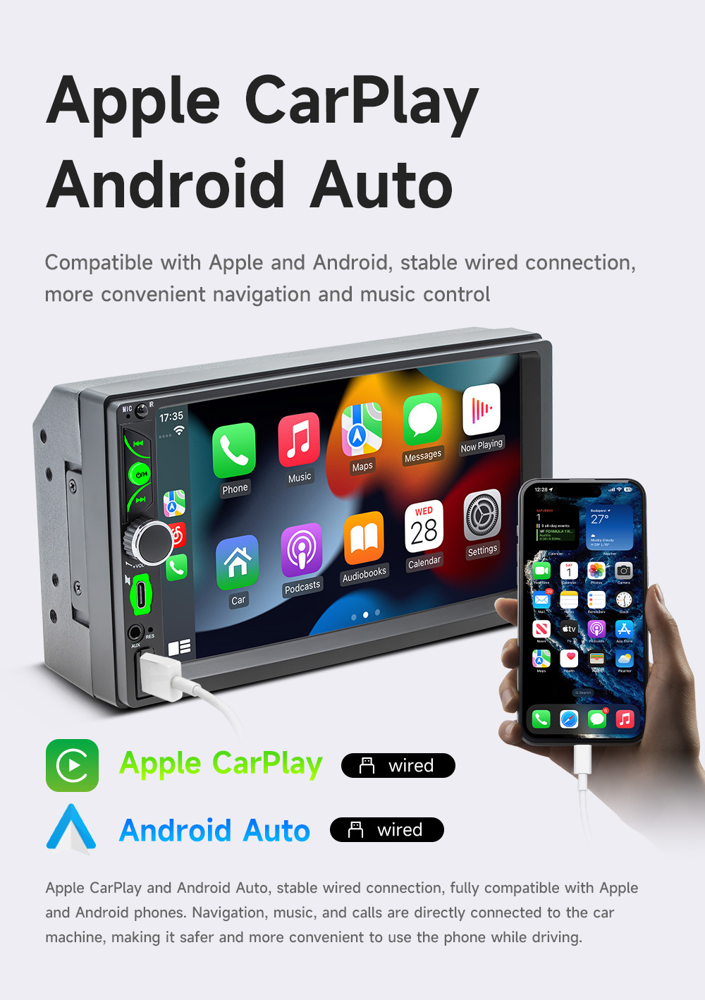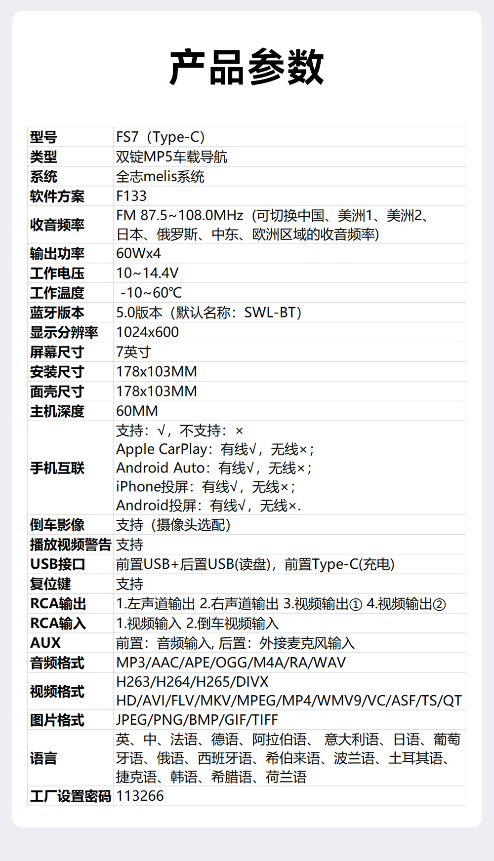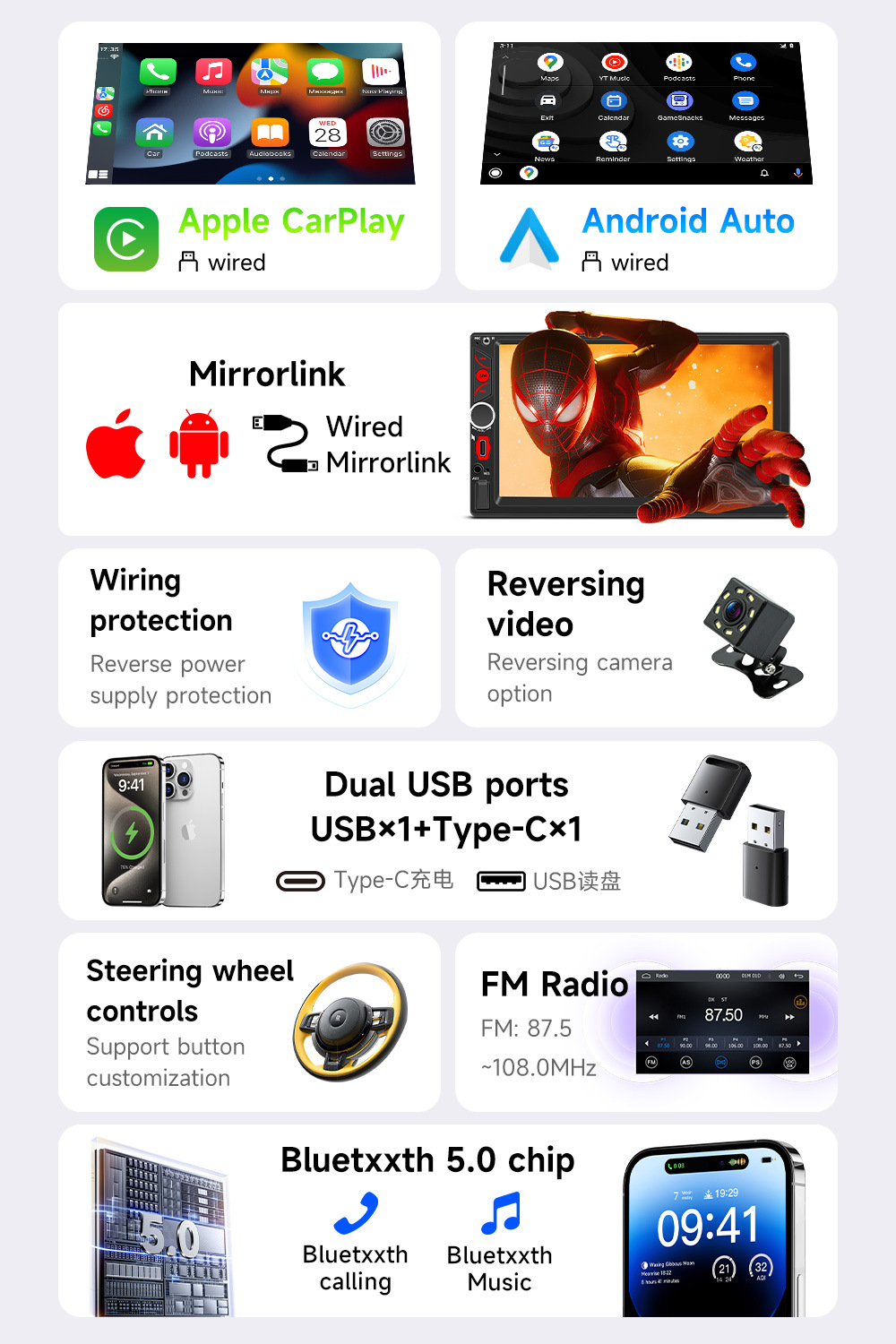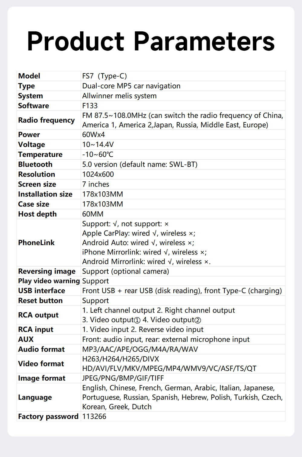 | Especificaciones | FS7 (Tipo-C) [carplay cableado], FS7 (Tipo-C) [carplay inalámbrico] |