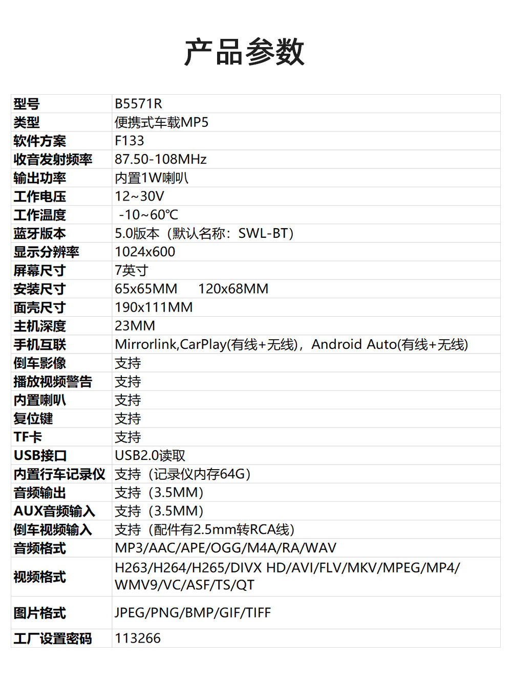 | Especificaciones | B5571R [estándar + carplay], B5571R [estándar + carplay + AHD] |