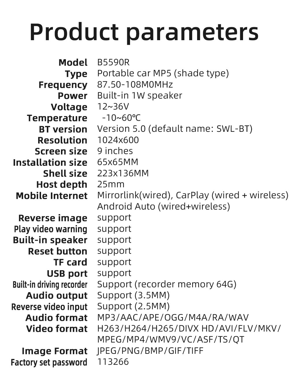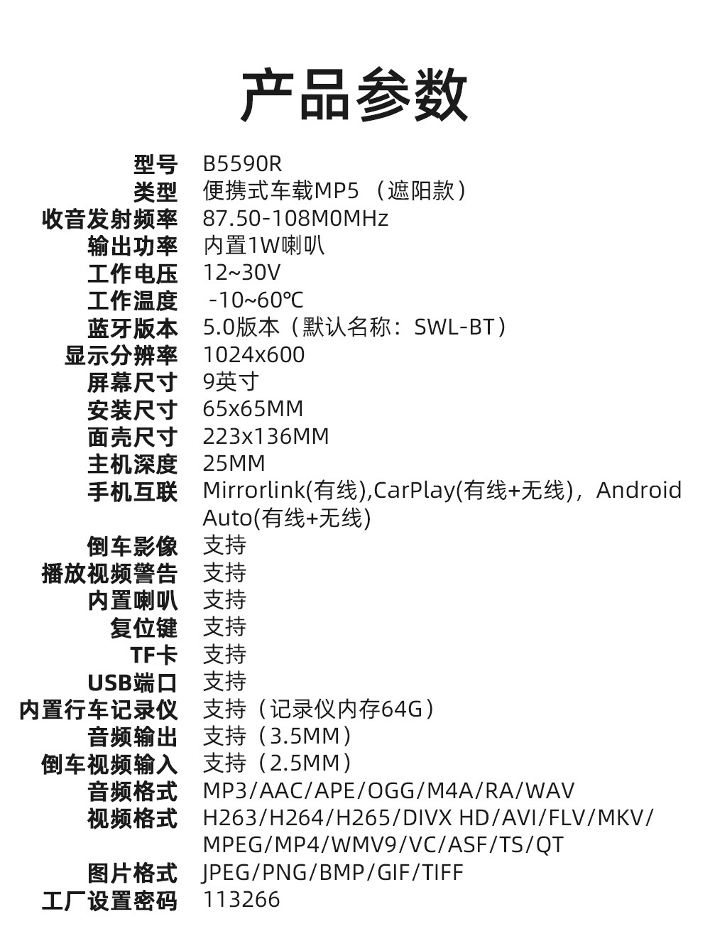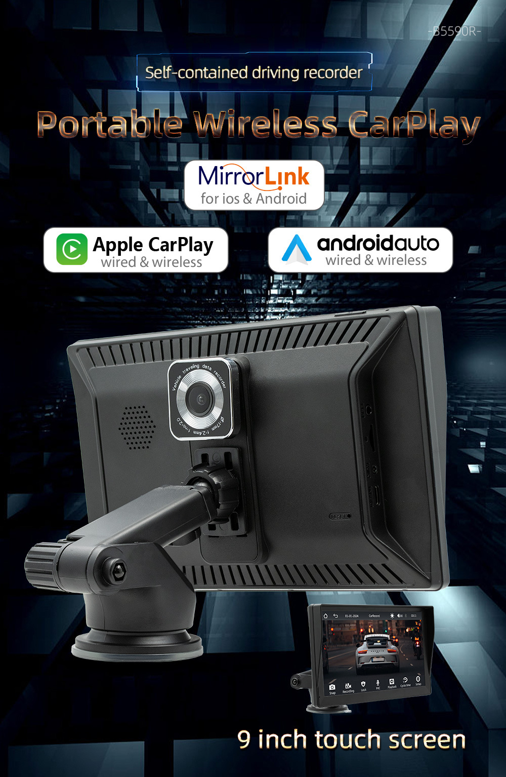 | Especificaciones | Carplay inalámbrico estándar B5590R,B5590R viene de serie con función inalámbrica carplay AHD (sin cámara) |