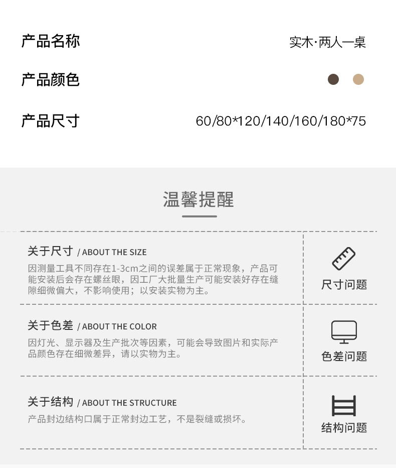 | Color | 【25mm实木生态板芯桌面】钢架腿南美胡桃色100cm,【25mm实木生态板芯桌面】钢架腿南美胡桃色120cm,【25mm实木生态板芯桌面】钢架腿南美胡桃色140cm,【30mm实木生态板芯桌面】钢架腿北美黑胡桃色100cm,【30mm实木生态板芯桌面】钢架腿北美黑胡桃色120cm,【30mm实木生态板芯桌面】钢架腿北美黑胡桃色140cm,【30mm实木生态板芯桌面】钢架腿北美黑胡桃色160cm,【30mm实木生态板芯桌面】钢架腿北美黑胡桃色180cm,实木腿胡桃色100*60*75【15MM加厚单桌】,实木腿胡桃色120*60*75【15MM加厚单桌】,实木腿胡桃色140*60*75【15MM加厚单桌】,实木腿胡桃色160*60*75【15MM加厚单桌】,实木腿原木色100*60*75【15MM加厚单桌】,实木腿原木色120*60*75【15MM加厚单桌】,实木腿原木色140*60*75【15MM加厚单桌】,实木腿原木色160*60*75【15MM加厚单桌】,实木腿胡桃色120*60*75【加厚30MM加厚单桌】,实木腿胡桃色140*60*75【加厚30MM加厚单桌】,实木腿胡桃色160*80*75【加厚30MM加厚单桌】,实木腿胡桃色180*80*75【加厚30MM加厚单桌】,实木腿原木色120*60*75【加厚30MM加厚单桌】,实木腿原木色140*60*75【加厚30MM加厚单桌】,实木腿原木色160*80*75【加厚30MM加厚单桌】,实木腿原木色180*80*75【加厚30MM加厚单桌】,30mm加厚桌面【100%全橡胶木】胡桃色100cm,30mm加厚桌面【100%全橡胶木】胡桃色120cm,30mm加厚桌面【100%全橡胶木】胡桃色140cm,30mm加厚桌面【100%全橡胶木】胡桃色160cm,30mm加厚桌面【100%全橡胶木】胡桃色180cm,30mm加厚桌面【100%全橡胶木】樱桃木色100cm,30mm加厚桌面【100%全橡胶木】樱桃木色120cm,30mm加厚桌面【100%全橡胶木】樱桃木色140cm,30mm加厚桌面【100%全橡胶木】樱桃木色160cm,30mm加厚桌面【100%全橡胶木】樱桃木色180cm,15MM加厚桌面【单人位实木椅组合】100cm胡桃色,15MM加厚桌面【单人位实木椅组合】120cm胡桃色,15MM加厚桌面【双人位实木椅组合】140cm胡桃色,15MM加厚桌面【双人位实木椅组合】160cm胡桃色,15MM加厚桌面【单人位实木椅组合】100cm原木色,15MM加厚桌面【单人位实木椅组合】120cm原木色,15MM加厚桌面【双人位实木椅组合】140cm原木色,15MM加厚桌面【双人位实木椅组合】160cm原木色,纯实木书桌搭配【实木书桌椅】浅胡桃色,纯实木书桌搭配【实木书桌椅】樱桃木色,钢架书桌搭配【实木书桌椅】黑胡桃色 |
