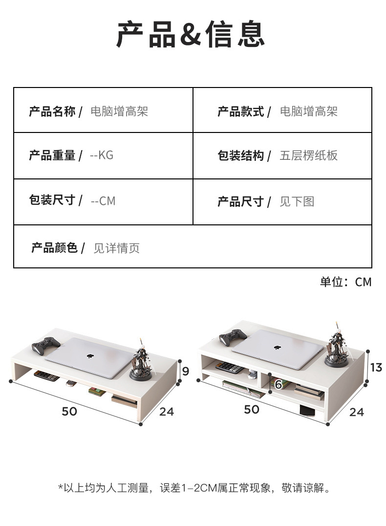 | Color | 【单层】暖白色电脑增高架40X18X6CM,【单层】暖白色显示器增高架50X20X8cm,【扩展增高架】单层40x18x14cm,【扩展增高架】单层50x20x16cm,【升级双层组合款】40cm单层+40cm扩展架,【升级双层组合款】50cm单层+50cm扩展架,【单层】暖白色-笔记本专用-40*24*6cm,【单层】暖白色-笔记本专用-50*24*8cm,【双层】暖白色-笔记本专用-40*24*11cm,【双层中格】白色-笔记本专用-50*24*13cm,【双层中格】白色组合-笔记本专用,【单层】北欧枫木色-笔记本专用-40*24*6cm★,【双层】北欧枫木色-笔记本专用-40*24*11cm,【单层】北欧枫木色-笔记本专用-50*24*8cm,【双层中格】北欧枫木色-笔记本专用-50*20*13cm,【双层中隔】白色-40*18*11cm,【双层】白色-50*20*13cm,【双层中格】白色-50*20*13cm,【H型收纳柜】白色-24*20*28cm,【笔筒款】白色-24*20*28cm,【收纳柜】白色-22*18*25cm,【收纳柜】白色-24*20*29cm,【单层】白色+H型柜子组合-74*20*28cm,【双层】白色+H型柜子组合-74*20*28cm,【双层中格】白色+H型柜子组合-74*20*28cm,【单层】白色+笔筒柜子组合-74*20*28cm,【双层】白色+笔筒柜子组合-74*20*28cm,【双层中格】白色+笔筒柜子组合-74*20*28cm,【单层】白色+柜子组合组合-75*20*27cm,【双层中格】白色+柜子组合组合-75*20*27cm,【单层】北欧枫木色-40*20*6cm★,【单层】北欧枫木色-50*20*8cm★,【双层】北欧枫木色-40*20*13cm★,【双层】北欧枫木色-50*20*13cm★,【双层中格】北欧枫木色-50*20*13cm★带格更耐用,【单层】北欧枫木色+柜子组合-75*20*27cm★,【双层中格】北欧枫木色+柜子组合-75*20*27cm★,【双层中格】北欧枫木色+笔筒柜子组合-74*20*28cm★,【双层中格】北欧枫木色+H型柜子组合-74*20*28cm★,【双层中格】北欧枫木色组合-笔记本专用★,【H型收纳柜】北枫木色-24*20*28cm★,【收纳柜】枫木色-22*20*27cm,【收纳柜】枫木色-25*20*27cm★,【笔筒+收纳柜】北枫木色-24*20*28cm★ |