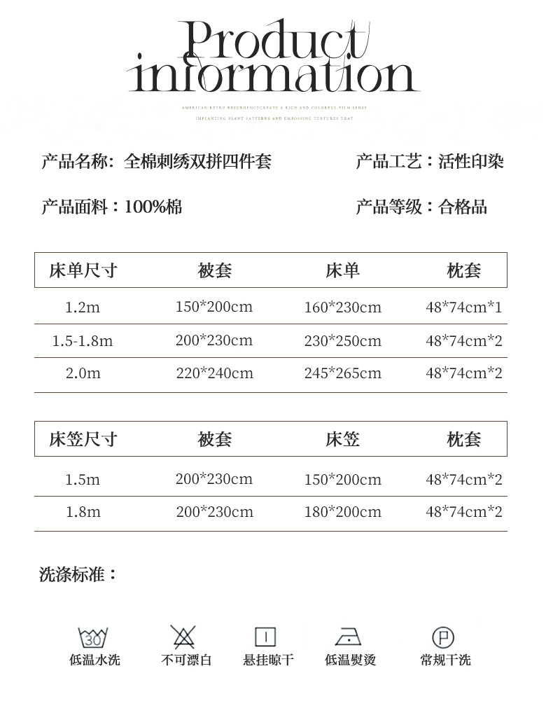 | Especificaciones de tamaño | Cama de 1,5 m [Juego de sábanas de cuatro piezas] Adecuado para edredón de 200x230cm,Cama de 1,8 m [Juego de sábanas de cuatro piezas] adecuado para edredón de 200x230cm,Cama de 2.0m [Juego de sábanas de cuatro piezas] Adecuado para edredón de 220x240cm,Cama de 1,5 m [juego de cuatro piezas de sábana] adecuada para edredón de 200x230cm,Cama de 1,8 m [juego de cuatro piezas de sábana] adecuado para edredón de 200x230cm |