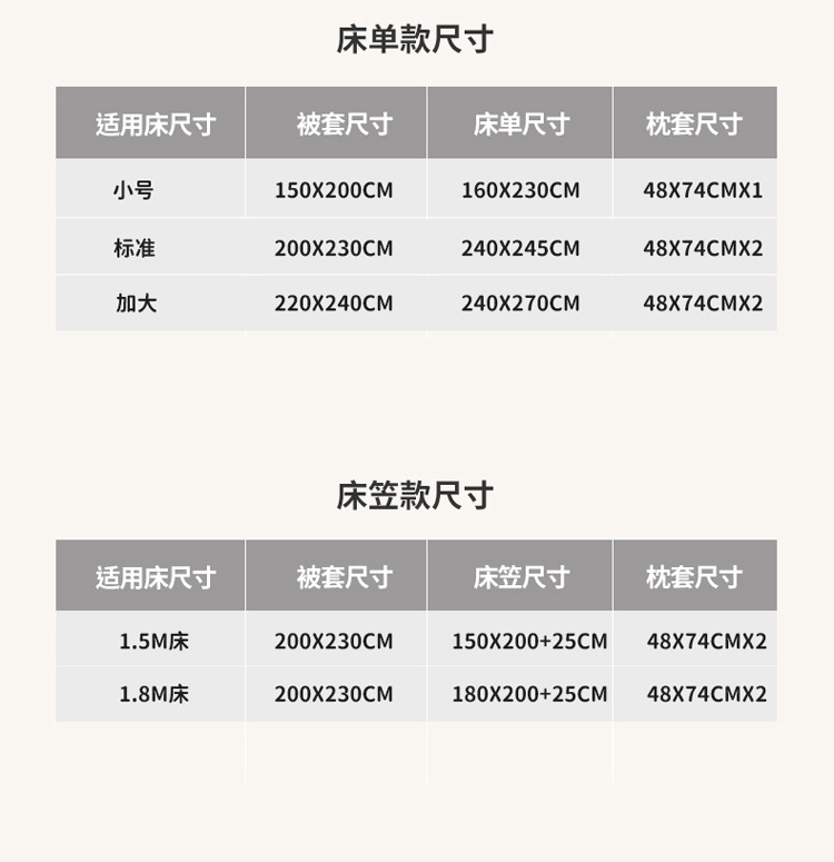 | Especificaciones de tamaño | 3 juegos de sábanas de 0,9 m, 3 juegos de sábanas de 1,2 m, 4 juegos de sábanas de 1,5 m, 4 juegos de sábanas de 1,8 m, 4 juegos de sábanas de 2,0 m, 3 juegos de sábanas de 0,9 m, 4 juegos de sábanas de 1,5 m, 4 juegos de sábanas de 1,8 m |