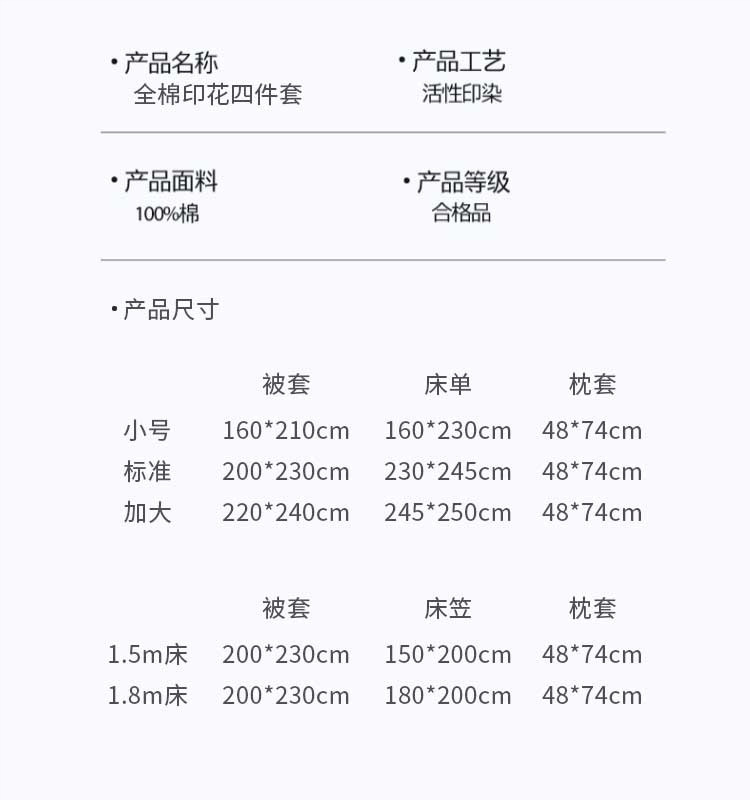 | Especificaciones de tamaño | Cama de 0,9 m [juego de sábanas de tres piezas] adecuado para núcleo de edredón de 150x200cm,Cama de 1,2 m [Juego de sábanas de tres piezas] adecuado para núcleo de edredón de 150x200cm,Cama de 1,5 m [Juego de sábanas de cuatro piezas] Adecuado para edredón de 200x230cm,Cama de 1,8 m [Juego de sábanas de cuatro piezas] adecuado para edredón de 200x230cm,Cama de 2.0m [Juego de sábanas de cuatro piezas] Adecuado para edredón de 220x240cm,Cama de 1,5 m [juego de cuatro piezas de sábana] adecuada para edredón de 200x230cm,Cama de 1,8 m [juego de cuatro piezas de sábana] adecuado para edredón de 200x230cm |