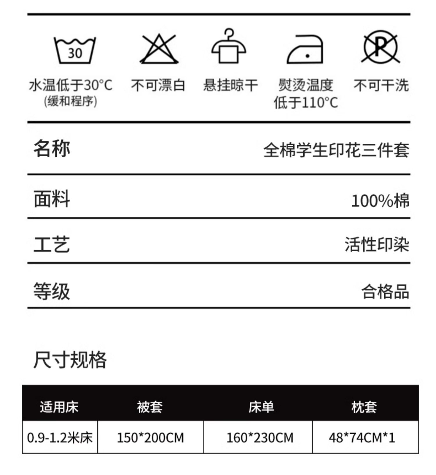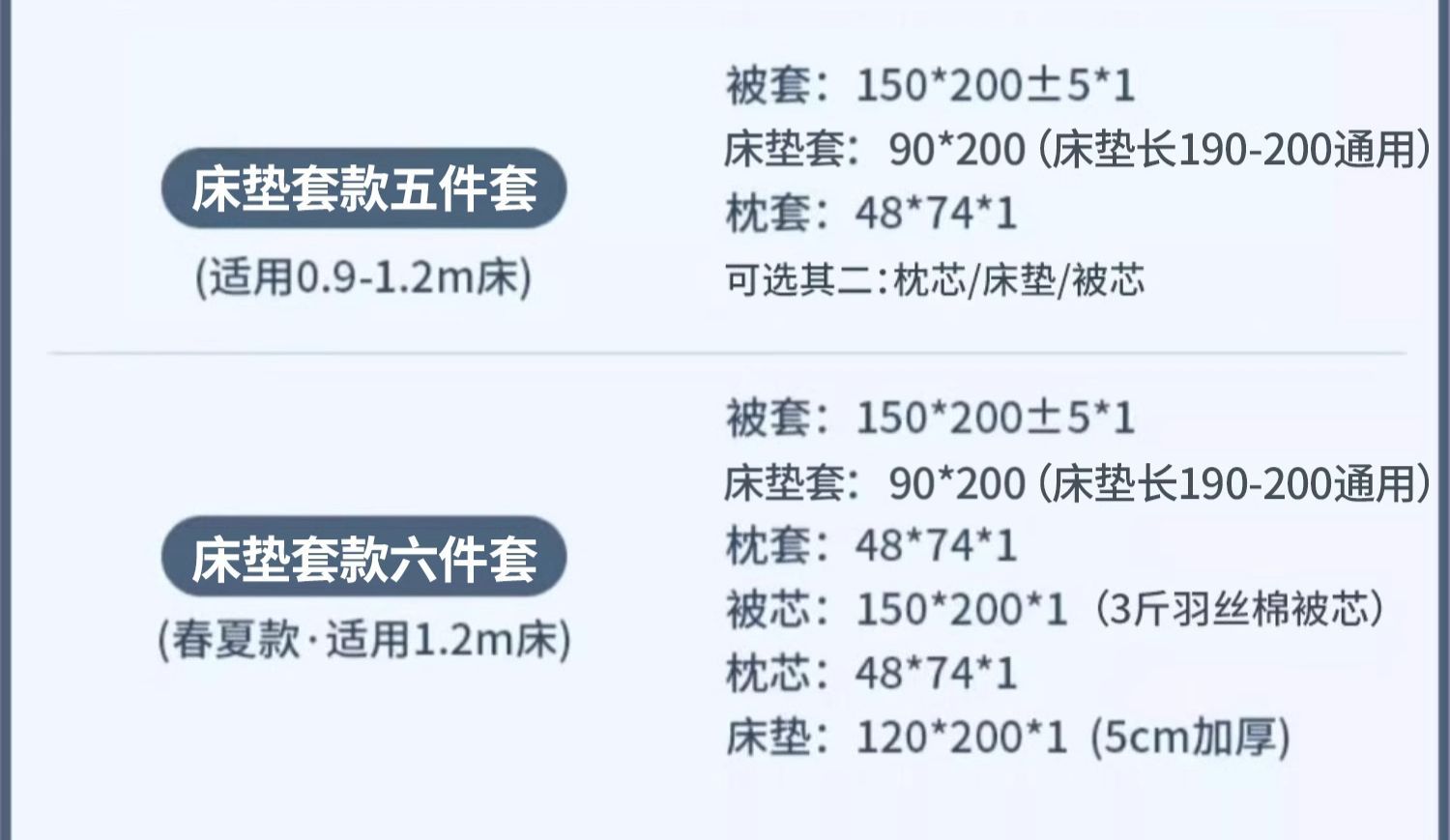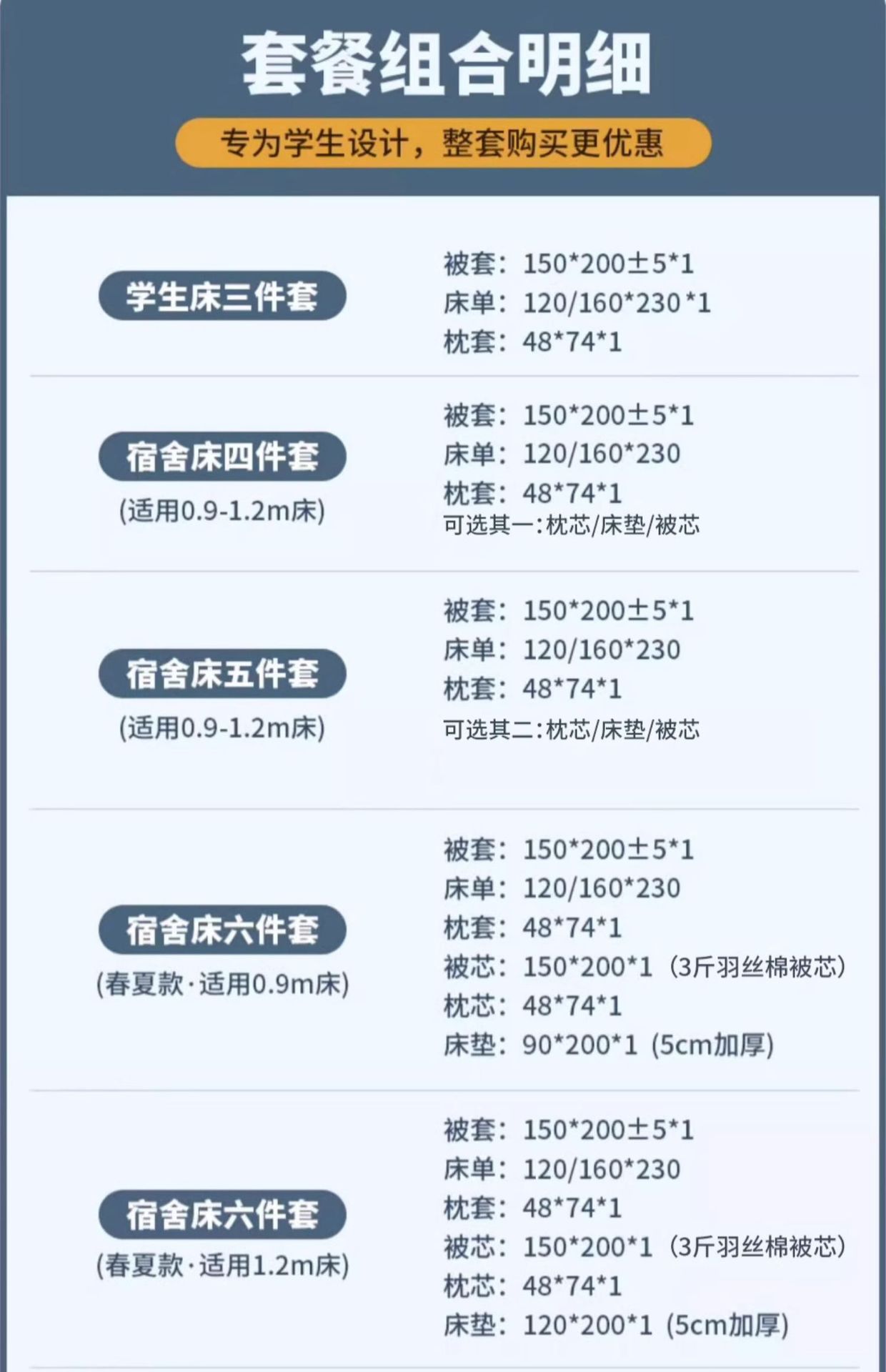 | Especificaciones de tamaño | 0.9m camas de estudiantes de tres piezas [sábanas + colchón + colchón], 0.9m camas de estudiantes de cuatro piezas [conjunto de tres piezas + núcleo de almohada], 0.9m camas de estudiantes de cuatro piezas [conjunto de tres piezas + 90x200cm camas], primavera y verano: 0.9m camas de estudiantes de cuatro piezas [conjunto de tres piezas + alrededor de 3 <unk> núcleo de edredón], otoño y invierno: 0.9m camas de estudiantes de cuatro piezas [conjunto de tres piezas + alrededor de 5 <unk> núcleo de edredón], 0.9m camas de estudiantes de cinco piezas [conjunto de tres piezas + núcleo de almohada + 90x200cm camas], primavera y verano: 0.9m cama de estudiantes cinco piezas juegos [conjunto de tres piezas + núcleo de almohada + alrededor de 3 <unk> núcleo de edredón], otoño y invierno: 0.9m cama de estudiantes cinco piezas juegos [conjunto de tres piezas + núcleo de almohada + alrededor de 5 <unk> núcleo de edredón], primavera y verano: 0.9m cama de estudiantes cinco piezas juegos [conjunto de tres piezas + alrededor de 3 <unk> núcleo de edredón + 90x200cm cama de edredón], otoño y invierno: 0.9m cama de estudiantes cinco piezas juegos [conjunto de tres piezas + alrededor de 5 <unk> núcleo de edredón + 90x200cm cama de edredón, primavera y verano: 0.9m cama de estudiantes seis piezas juegos [conjunto de tres piezas + núcleo de almohada + alrededor de 3 kg de núcleo de edredón + 90x200 cama de cocina], otoño y invierno: 0.9m cama de estudiantes seis piezas juegos [conjunto de tres piezas + núcleo de almohada + alrededor de 5 kg de núcleo de edredón + 90x200 cama de cocina], 1.2m cama de tres piezas juegos [sábanas + edredón + funda de almohada], 1.2m cama de cuatro piezas juegos [sábanas de tres piezas + núcleo de almohada], 1.2m cama de cuatro piezas juegos [sábanas de tres piezas + 120x200 cama de cocina], primavera y verano: 1.2m sábanas de cuatro piezas [conjunto de tres piezas + alrededor de 3 <unk> núcleo de edredón], otoño y invierno: 1.2m sábanas de cuatro piezas [conjunto de tres piezas + alrededor de 5 <unk> núcleo de edredón], 1.2m sábanas de cinco piezas [conjunto de tres piezas + núcleo de almohada + 120x200 sábanas], primavera y verano: 1.2m sábanas de cinco piezas [conjunto de tres piezas + núcleo de almohada + alrededor de 3 <unk> núcleo de edredón], otoño y invierno: 1.2m sábanas de cinco piezas [conjunto de tres piezas + núcleo de almohada + alrededor de 5 <unk> núcleo de edredón], primavera y verano: 1.2m cama de cinco piezas conjunto [conjunto de tres piezas + alrededor de 3 <unk> núcleo de edredón + 120x200 cama de cocina], otoño y invierno: 1.2m cama de cinco piezas conjunto [conjunto de tres piezas + alrededor de 5 <unk> núcleo de edredón + 120x200 cama de cocina], primavera y verano: 1.2m cama de seis piezas conjunto [conjunto de tres piezas + núcleo de almohada + alrededor de 3 <unk> núcleo de edredón + 120x200 cama de cocina], otoño y invierno: 1.2m cama de seis piezas conjunto [conjunto de tres piezas + núcleo de almohada + alrededor de 5 <unk> núcleo de edredón + 120x200 cama de cocina] |