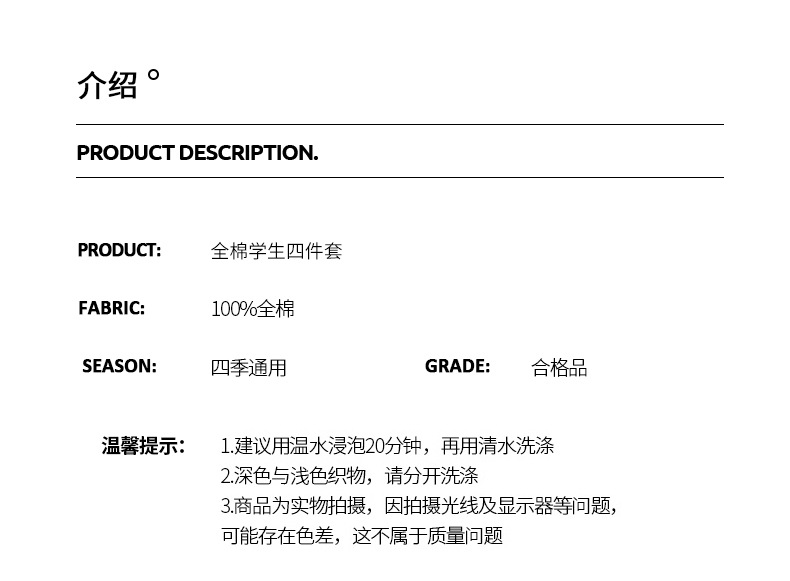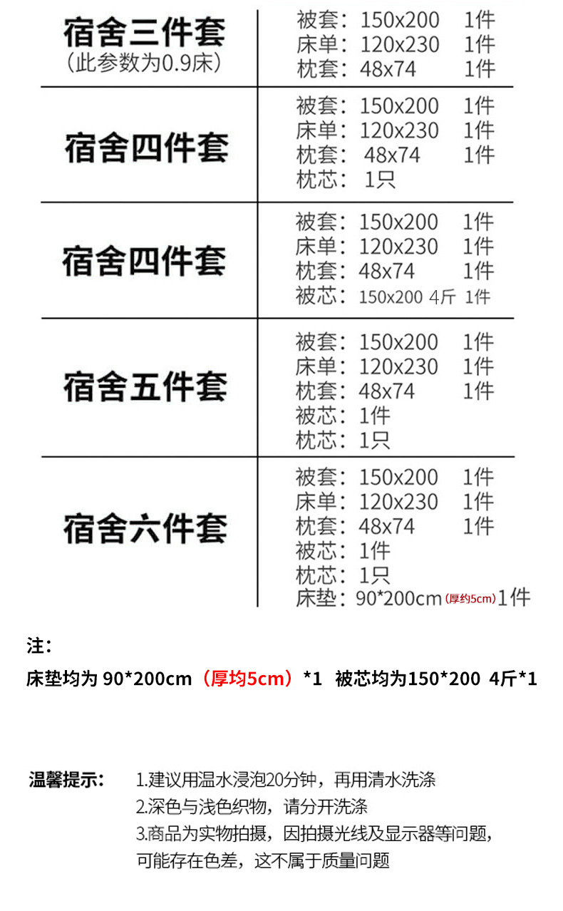 | Especificaciones de tamaño | Juego de cama de tres piezas de 0,8 m [funda de edredón 150*200cm sábana 105*225cm],Juego de cama de tres piezas de 0,9 m [funda de edredón 150*200cm sábana 120*230cm],Juego de cama de tres piezas de 1,0 m [funda de edredón 150*200cm sábana 160*230cm],Juego de cama de 1,2 m de tres piezas [funda de edredón 160*210cm sábana 160*230cm],Juego de cama de tres piezas de 1,35 m [funda de edredón 160*210cm sábana 180*230cm],Juego de cama de tres piezas de 1,5 m [funda de edredón 160*210cm sábana 200*230cm],Juego de cuatro piezas para el hogar [funda de edredón 200*230cm sábana 230*245cm],Juego de cuatro piezas de cama de 0,9 m [funda de edredón * 1 sábana * 1 funda de almohada * 1 núcleo de almohada * 1],Juego de cuatro piezas de cama de 0,9 m [funda de edredón * 1 sábana * 1 funda de almohada * 1 núcleo de edredón * 1],Juego de cuatro piezas de cama de 0,9 m [funda de edredón * 1 sábana * 1 funda de almohada * 1 colchón * 1],Juego de cinco piezas de cama de 0,9 m [funda de edredón * 1 sábana * 1 funda de almohada * 1 núcleo de almohada * 1 núcleo de edredón * 1],Juego de cinco piezas de cama de 0,9 m [funda de edredón * 1 sábana * 1 funda de almohada * 1 núcleo de almohada * 1 colchón * 1],Juego de cinco piezas de cama de 0,9 m [funda de edredón * 1 sábana * 1 funda de almohada * 1 núcleo de edredón * 1 colchón * 1],Juego de seis piezas de cama de 0,9 m [funda de edredón * 1 sábana * 1 funda de almohada * 1 núcleo de almohada * 1 núcleo de edredón * 1 colchón * 1],Juego de cuatro piezas de cama de 1,2 m [funda de edredón * 1 sábana * 1 funda de almohada * 1 núcleo de almohada * 1],Juego de cuatro piezas de cama de 1,2 m [funda de edredón * 1 sábana * 1 funda de almohada * 1 núcleo de edredón * 1],Juego de cama de 1,2 metros de cinco piezas [funda de edredón * 1 sábana * 1 funda de almohada * 1 núcleo de almohada * 1 núcleo de edredón * 1],Juego de cuatro piezas de cama de 1,5 m [funda de edredón * 1 sábana * 1 funda de almohada * 1 núcleo de almohada * 1],Juego de cuatro piezas de cama de 1,5 m [funda de edredón * 1 sábana * 1 funda de almohada * 1 núcleo de edredón * 1],Juego de cinco piezas de cama de 1,5 m [funda de edredón * 1 sábana * 1 funda de almohada * 1 núcleo de almohada * 1 núcleo de edredón * 1] |