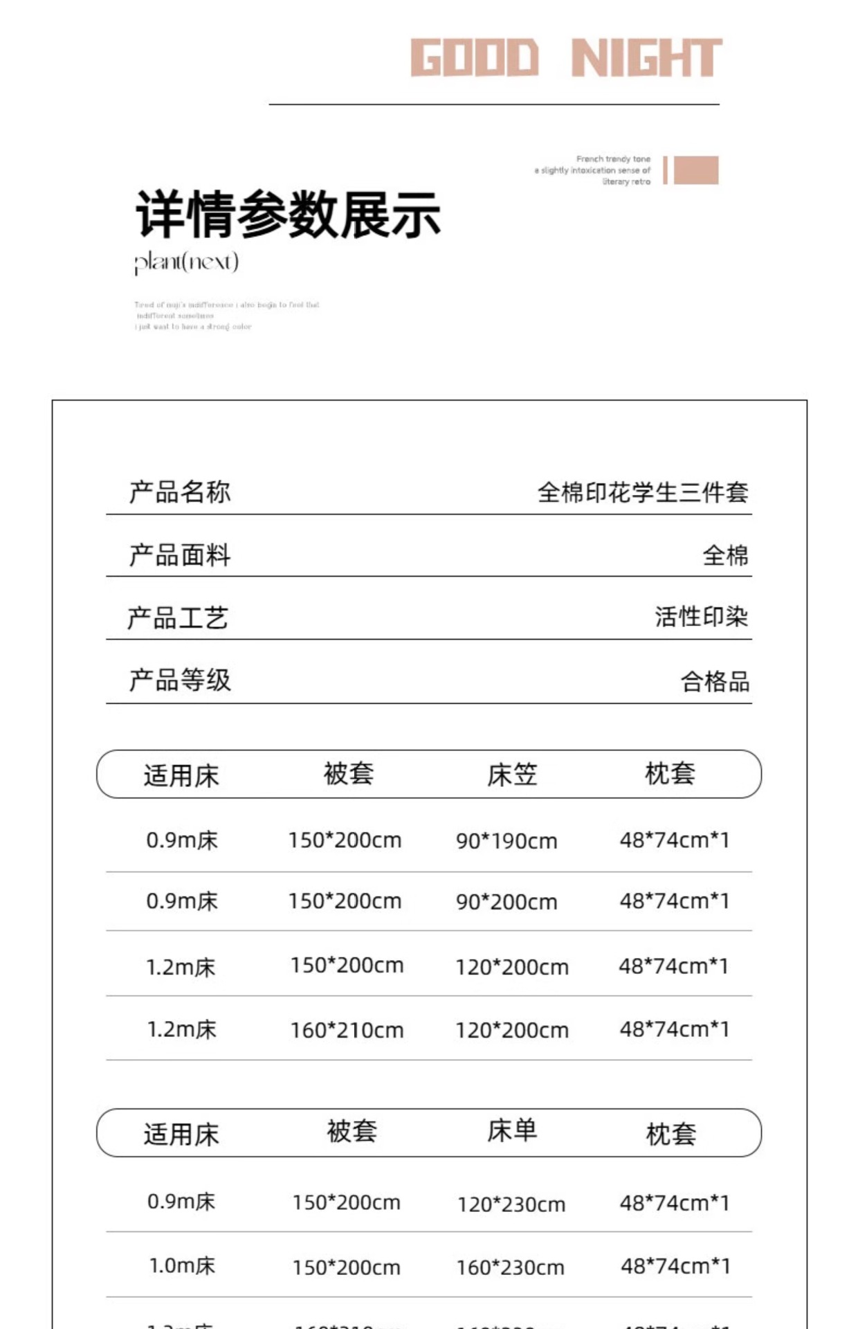 | Especificaciones de tamaño | 0.9 Juego de sábanas de tres piezas [funda de edredón 150*200cm sábana 120*230cm],1.0 Juego de sábanas de tres piezas [funda de edredón 150*200cm sábana 160*230cm],1.2 Juego de sábanas de tres piezas [funda de edredón 160*210cm sábana 160*230cm],1.35 Juego de sábanas de tres piezas [funda de edredón 160*210cm sábanas 200*230cm],Juego de tres piezas de cama de 0,9 m [funda de edredón 150*200cm funda de cama 90*190cm],Juego de tres piezas de cama de 0,9 m [funda de edredón 150*200cm funda de cama 90*200cm],Juego de cama de 1,2 m de tres piezas [funda de edredón 150*200cm funda de cama 120*200cm],Juego de cama de 1,2 m de tres piezas [funda de edredón 160*210cm funda de cama 120*200cm] |