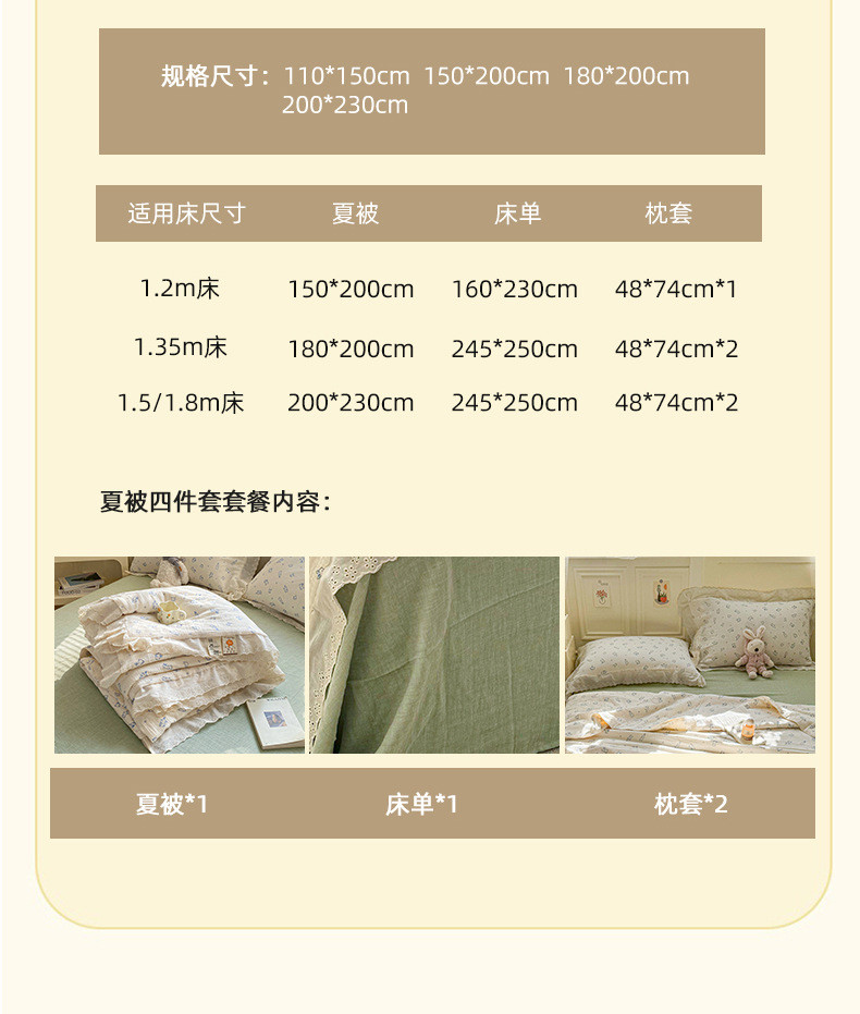| Especificaciones de tamaño | 150*200cm edredones de verano un par de fundas de almohada,150*200cm edredón de verano 160*230cm sábanas par de fundas de almohada,180*200cm edredones de verano 245*250cm sábanas par de fundas de almohada,200*230cm edredones de verano 245*250cm sábanas par de fundas de almohada |
