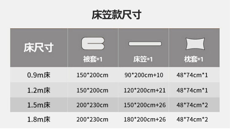 | Especificaciones de tamaño | Traje de tres piezas para estudiantes con cama de 0,9 m (funda de edredón 150*200cm/sábana 120*210cm),Juego de sábanas de tres piezas de 1,2 m (funda de edredón 150*200cm/sábana 160*230cm),Juego de tres piezas de cama de 0,9 m (funda de edredón 150*200cm/funda de cama 90*200cm),Juego de tres piezas con funda de colchón de 0,9 m (funda de edredón 150*200cm/funda de colchón 90*200cm),Juego de cama de 1,2 m de tres piezas (funda de edredón 150*200cm/funda de cama 120*200cm),Juego de sábanas de 1,5 m de cuatro piezas (funda edredón 200*230cm/sábana 230*245cm),Juego de sábanas de cuatro piezas de 1,8 m (funda edredón 200*230cm/sábana 230*245cm),Juego de cuatro piezas de sábanas de 2.0 m (funda edredón 220*240cm/sábana 245*270cm),Juego de cuatro piezas de cama de 1,5 m (funda de edredón 200*230cm/funda de cama 150*200cm),Juego de cuatro piezas de cama de 1,8 m (funda de edredón 200*230cm/funda de cama 180*200cm) |