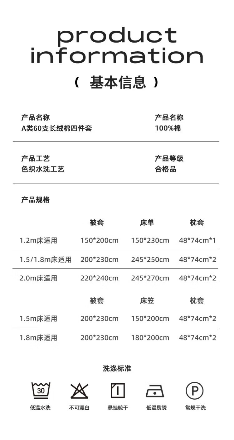 | Especificaciones de tamaño | Juego de tres sábanas de 0,9 / 1,2 m - juego de cuatro sábanas de 150 * 200,1,8 M - juego de cuatro sábanas de 200 * 230,1,5 M - juego de cuatro sábanas de 200 * 230,2,0 M - juego de cuatro sábanas de 220 * 240,1,5 / 1,8 m - juego de cuatro sábanas de 200 * 230 |