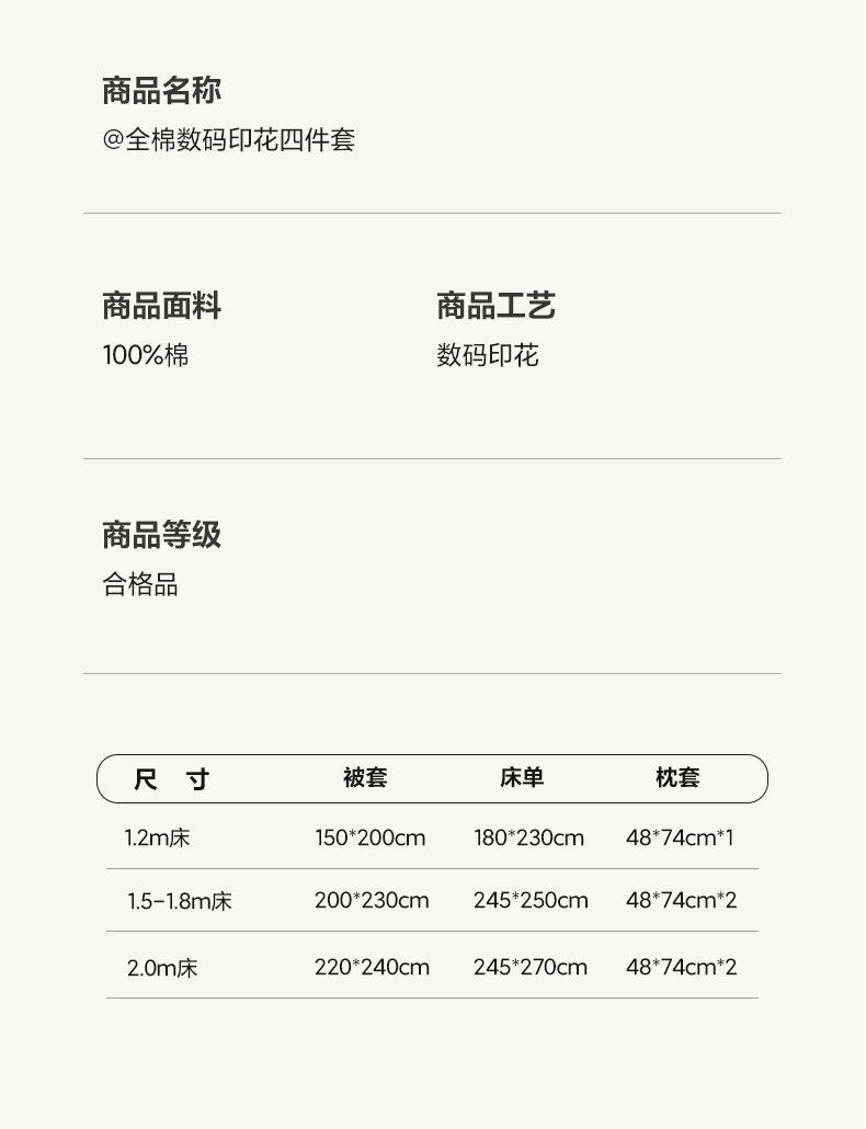 | Especificaciones de tamaño | Cama de estudiante de 0.9m [Juego de sábanas de tres piezas] Adecuado para edredón de 150x200cm,Cama de 1,2 m [Juego de sábanas de tres piezas] adecuado para núcleo de edredón de 150x200cm,Cama de 1,5 m [Juego de sábanas de cuatro piezas] Adecuado para edredón de 200x230cm,Cama de 1,8 m [Juego de sábanas de cuatro piezas] adecuado para edredón de 200x230cm,Cama de 2.0m [Juego de sábanas de cuatro piezas] Adecuado para edredón de 220x240cm,Cama de 1,5 m [juego de cuatro piezas de sábana] adecuada para edredón de 200x230cm,Cama de 1,8 m [juego de cuatro piezas de sábana] adecuado para edredón de 200x230cm |