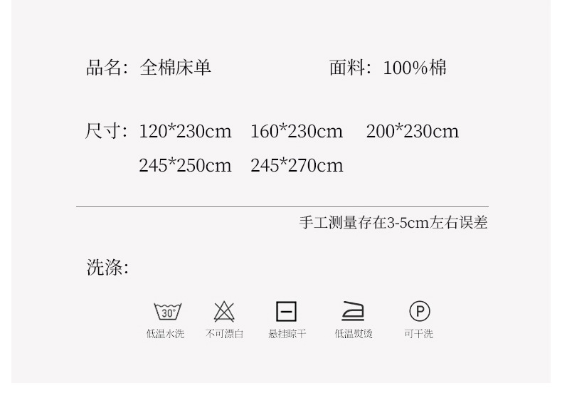 | Especificaciones de tamaño | Ropa de cama individual: 120*230cm [adecuado para camas de 0,8-0,9 m],Sábanas individuales: 160*230cm [adecuado para camas de 0,9-1,2 m],Ropa de cama individual: 200*230cm [adecuado para cama de 1,5 m],Sábanas individuales: 245*250cm [adecuado para cama de 1,8 m],Ropa de cama individual: 245*270cm [adecuado para una cama de 2.0m],Sábana de dos piezas-120*230cm [Una funda de almohada de sábana],Juego de sábanas de tres piezas-160*230cm [un par de sábanas y fundas de almohada],Juego de sábanas de tres piezas-200*230cm [un par de sábanas y fundas de almohada],Juego de sábanas de tres piezas-245*250cm [un par de sábanas y fundas de almohada],Juego de sábanas de tres piezas-245*270cm [un par de sábanas y fundas de almohada] |