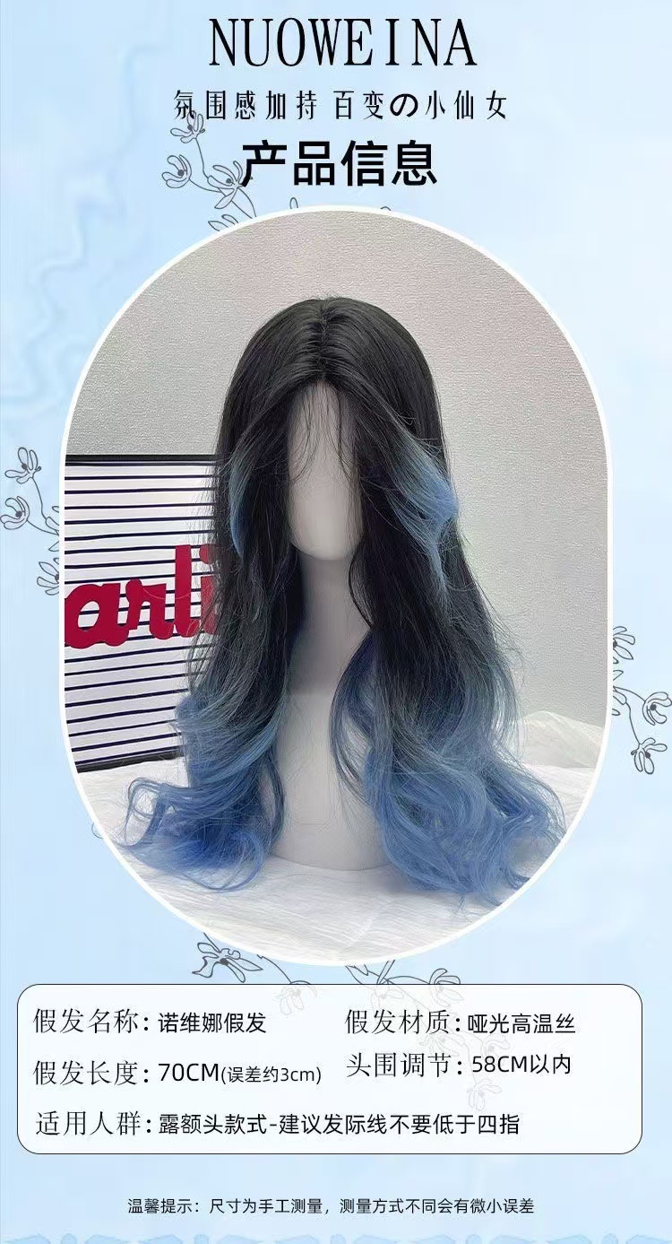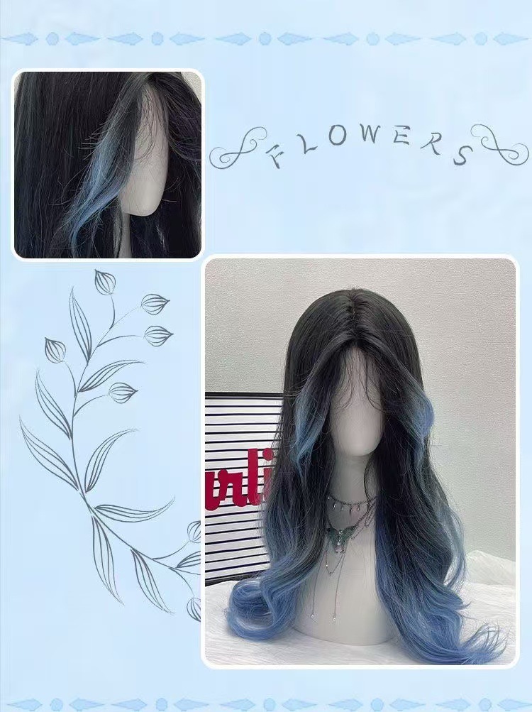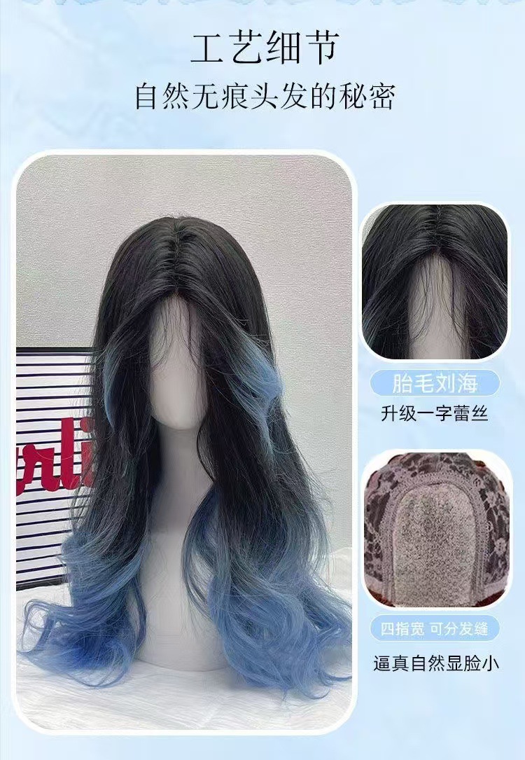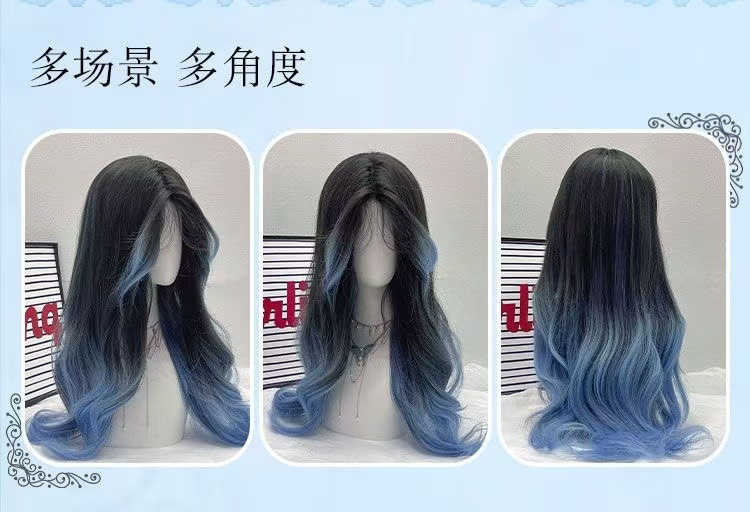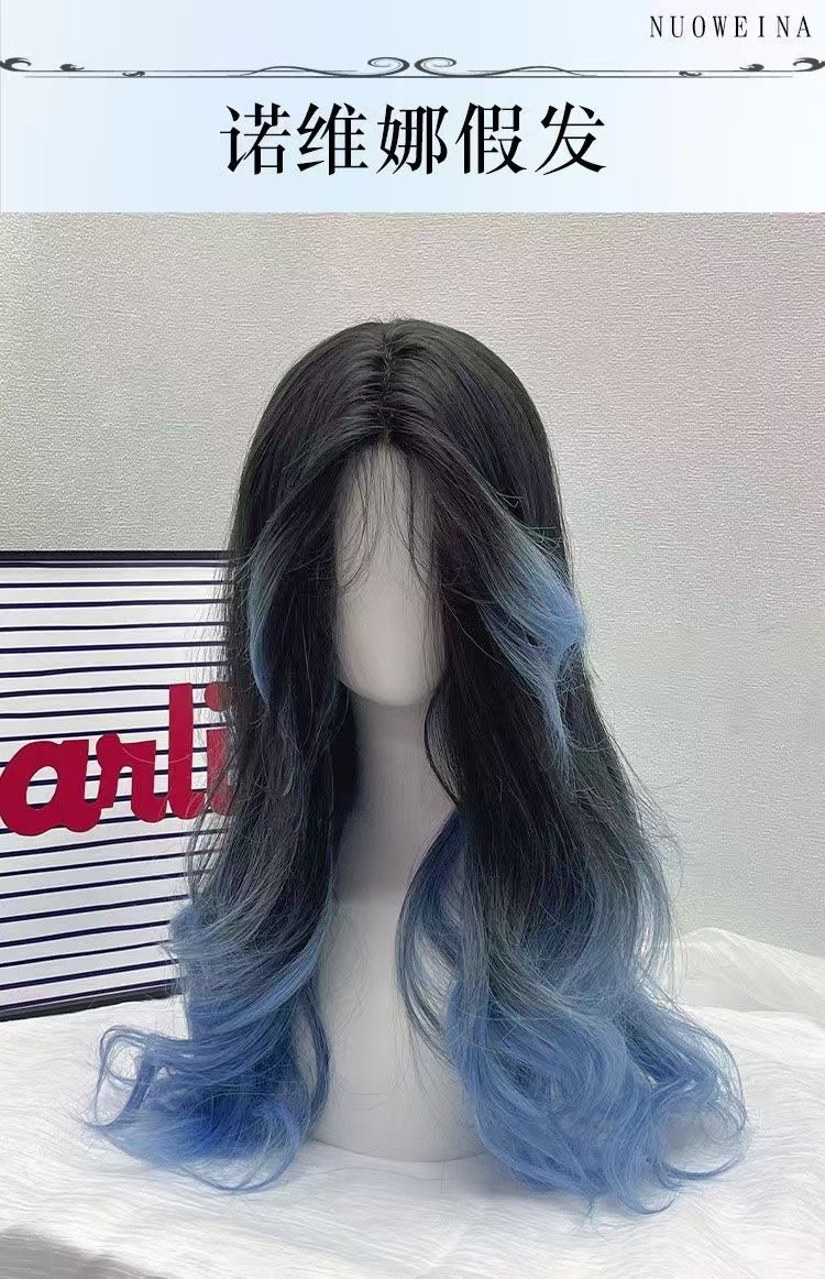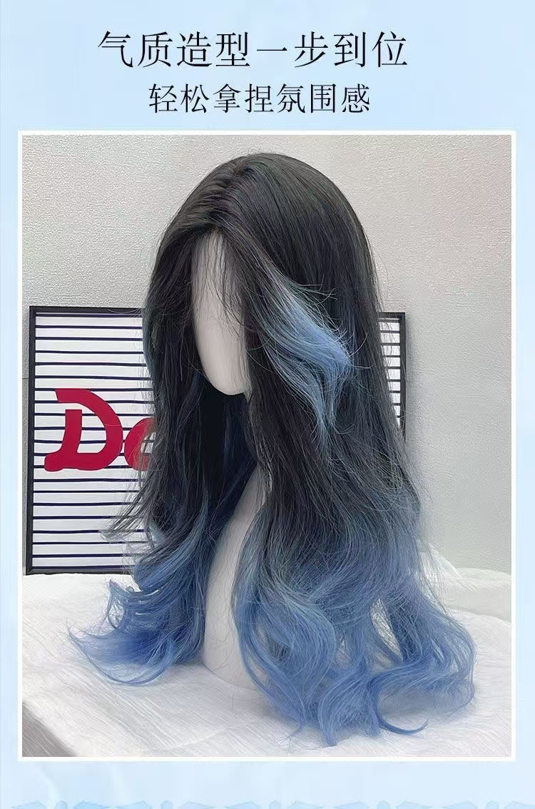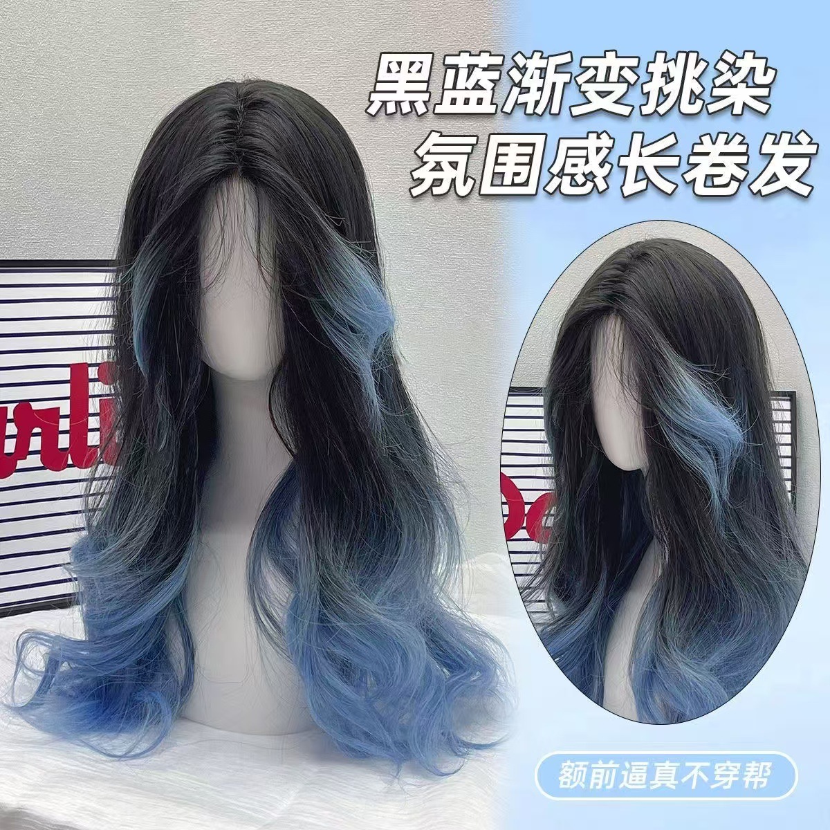 Azul y negro gradiente largo rizado peluca picante teñido simulación de alta temperatura seda pintada teñida atmósfera princesa peluca B03