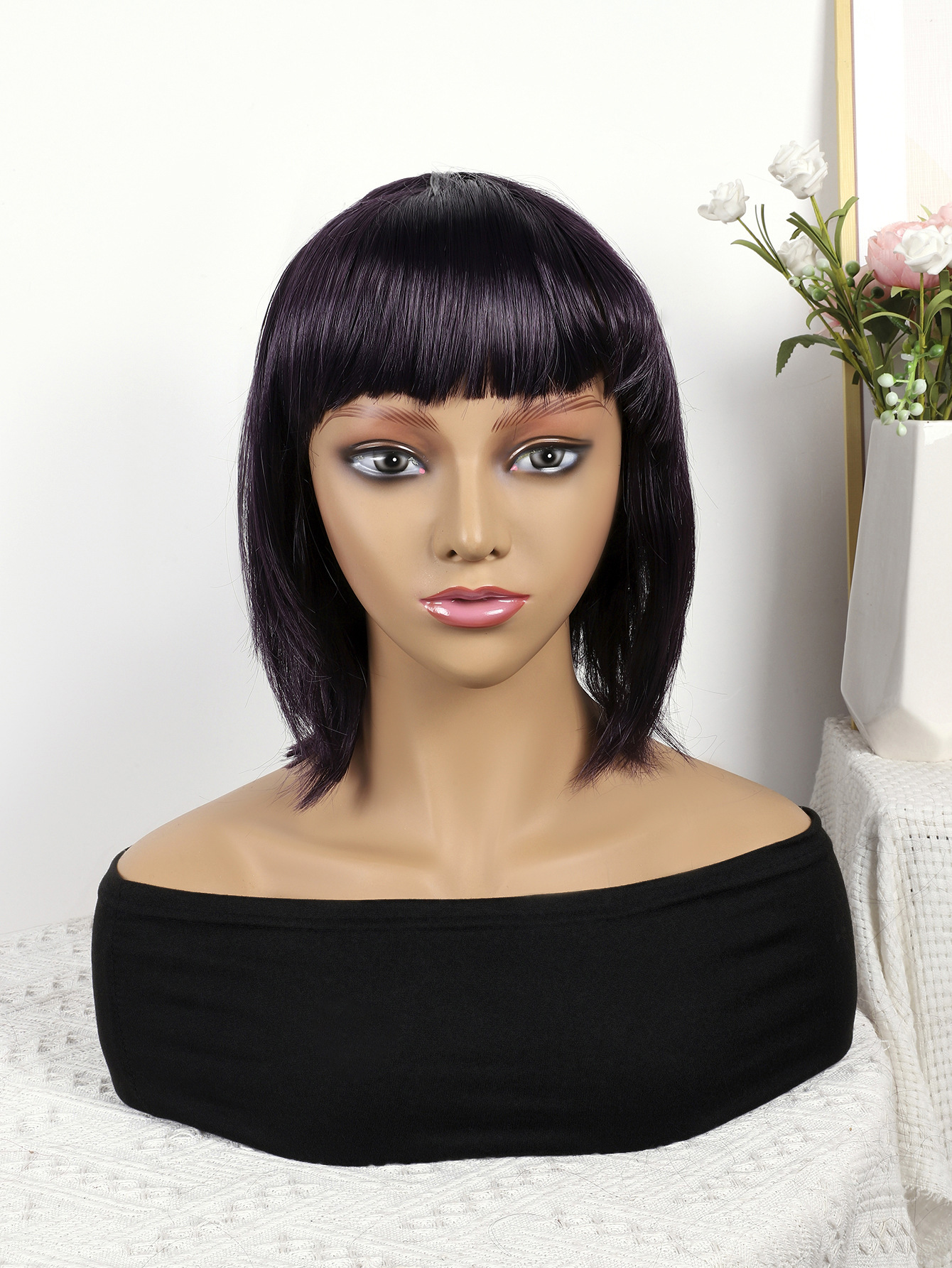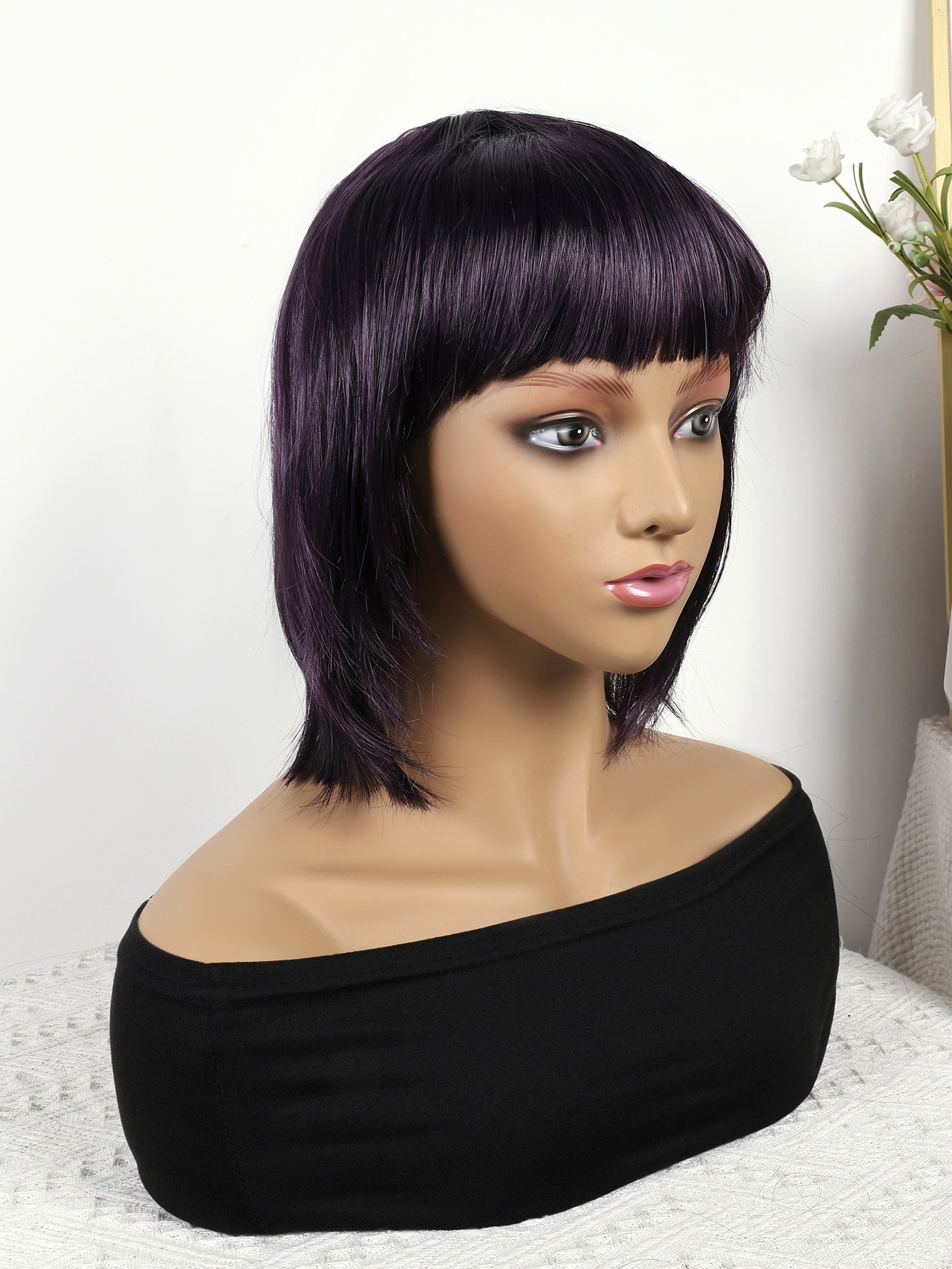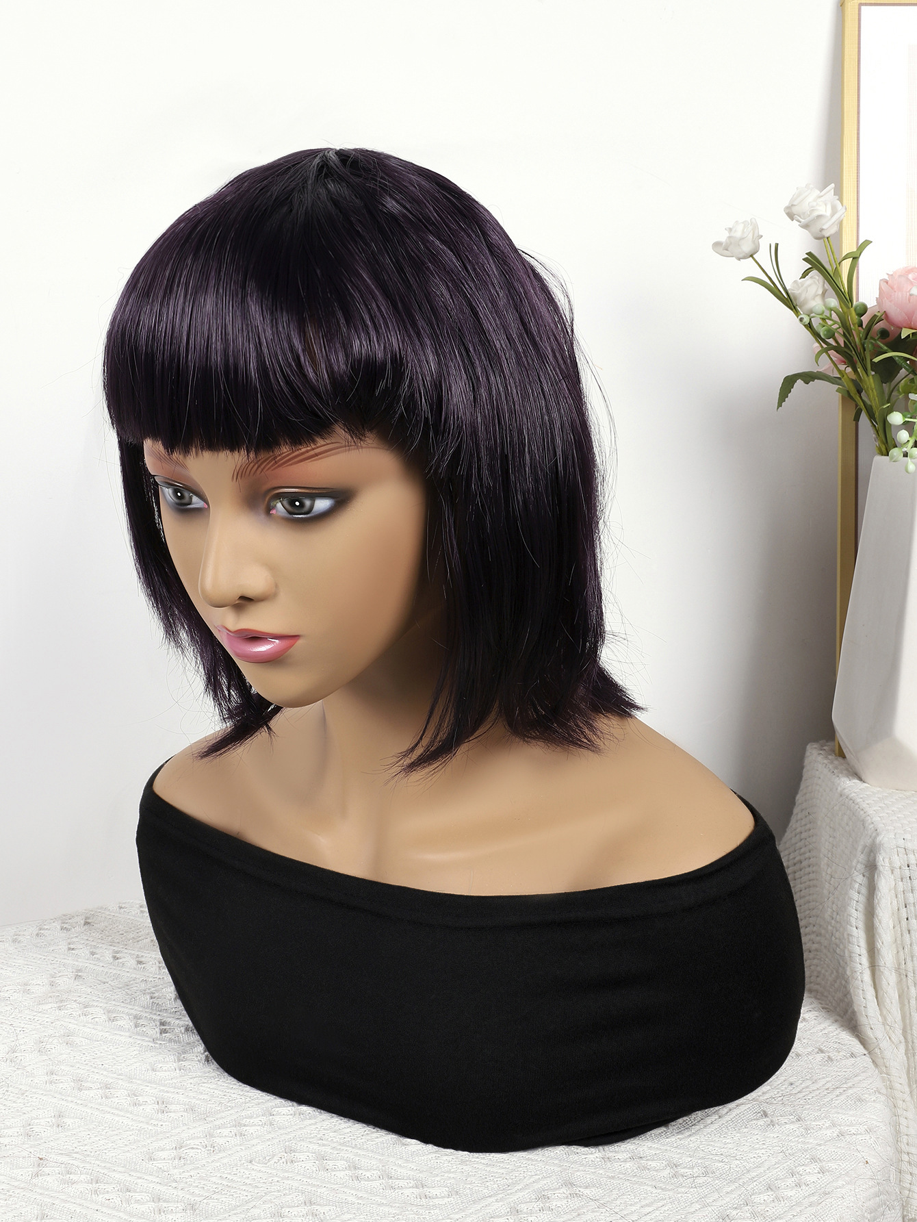 Comercio exterior europeo y americano moda transfronteriza nueva peluca femenina negro natural recto Bangs hombro Bobo pelo corto recto cubierta de la cabeza completa