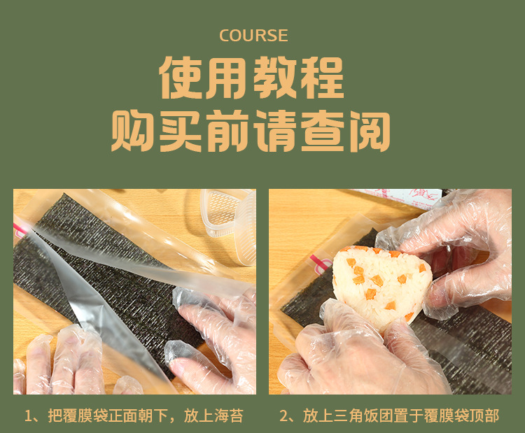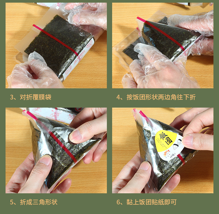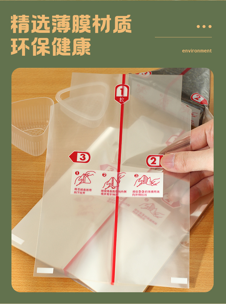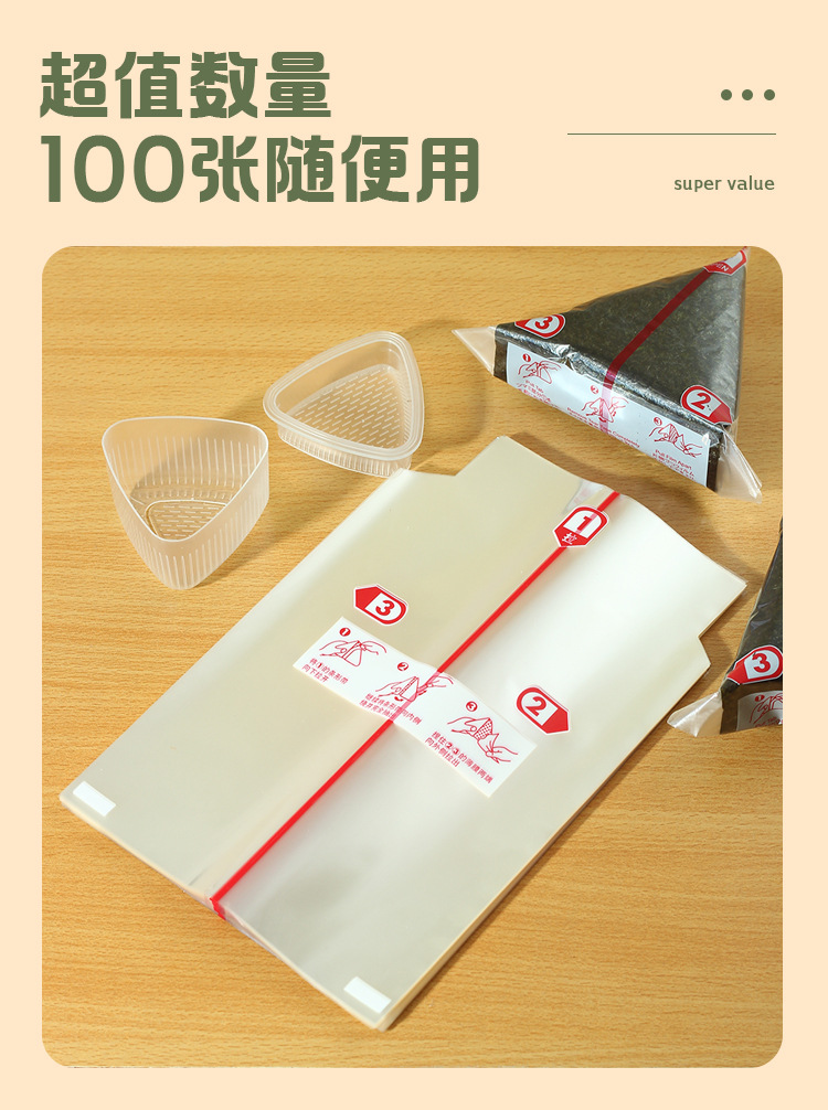 | Especificaciones y modelos | 100 bolsas de cubierta de alga de doble capa, 200 bolsas de cubierta de alga de una sola capa, 100 bolsas de cubierta de alga de doble capa (incluyendo pegatinas), 200 bolsas de cubierta de alga de una sola capa (incluyendo pegatinas), 100 pegatinas de bolsas de masa de arroz naranja, 100 bolsas de cubierta de alga de doble capa (incluyendo pegatinas) + 100 piezas de algas medio cortadas |