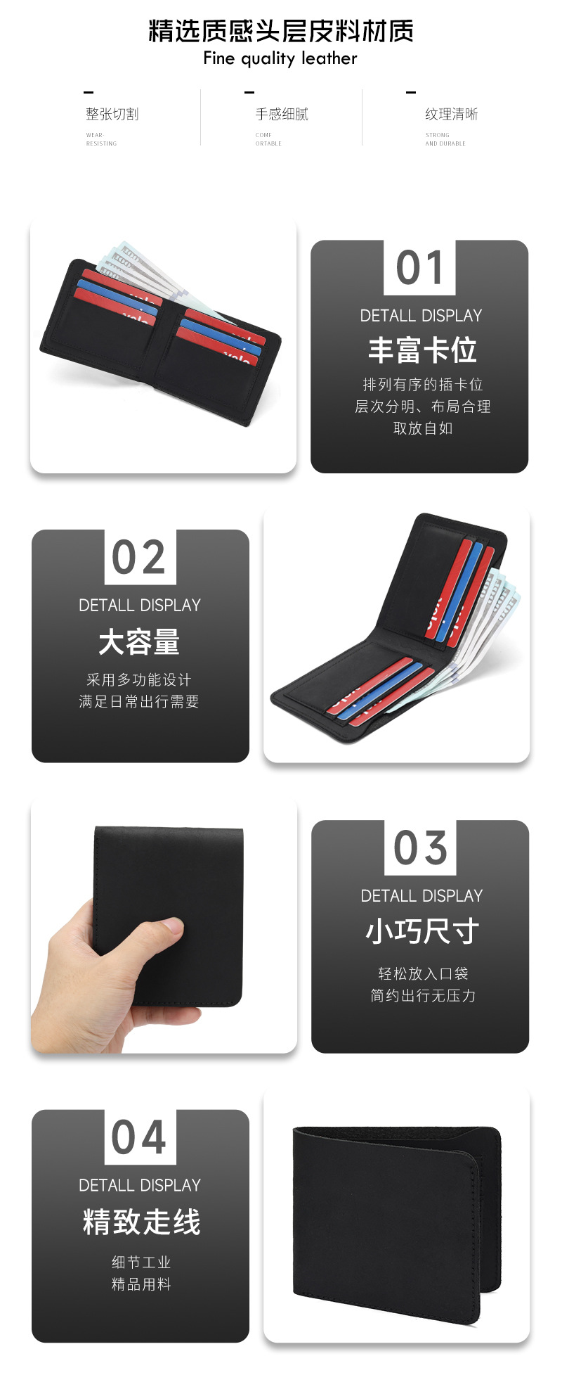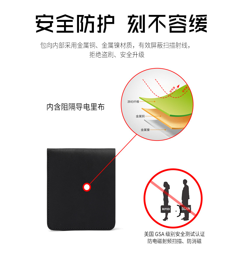 Monedero comercial de gran capacidad de comercio exterior personalizado, clip de cuero con cepillo antirrobo multifuncional, monedero de piel de vaca de primera capa para hombres