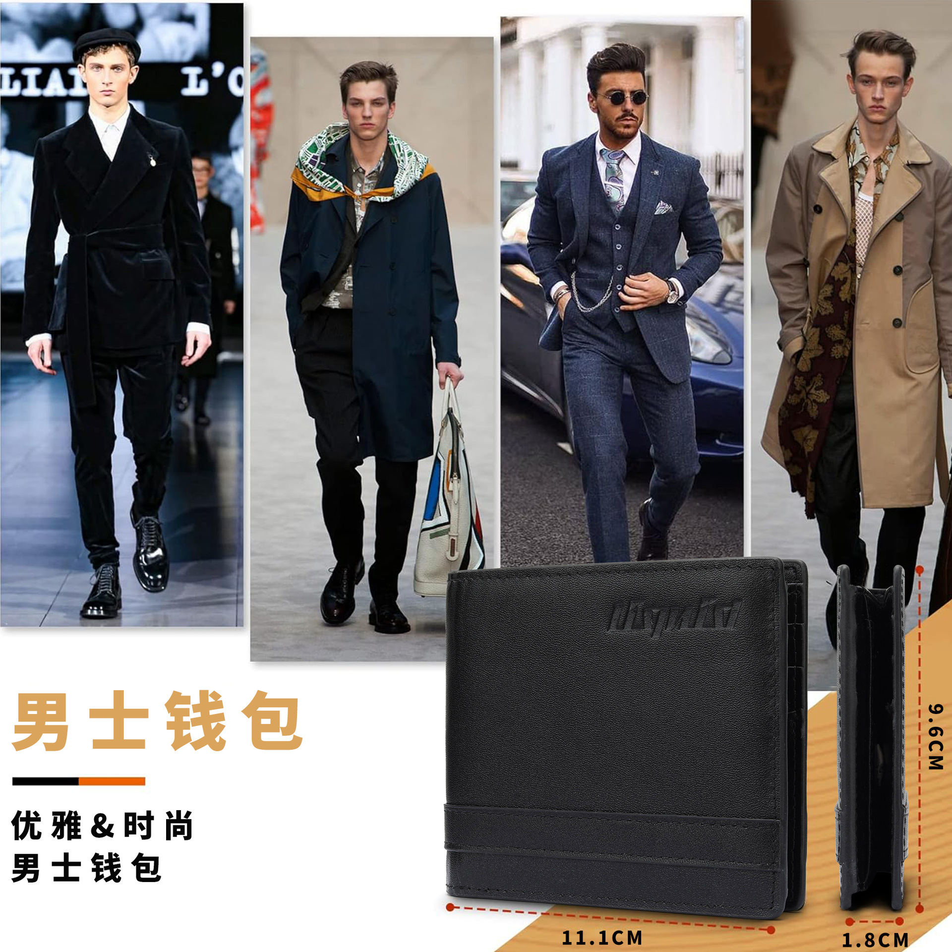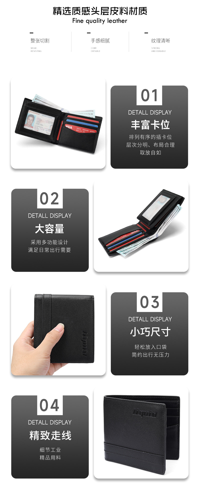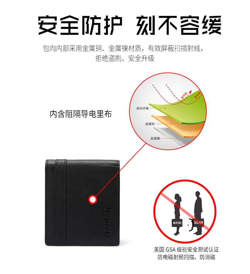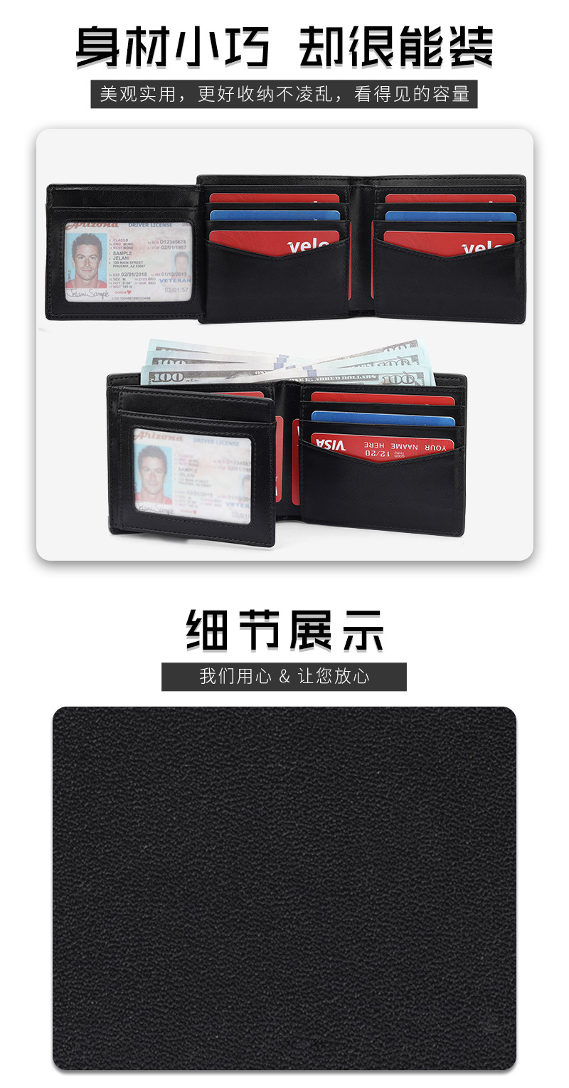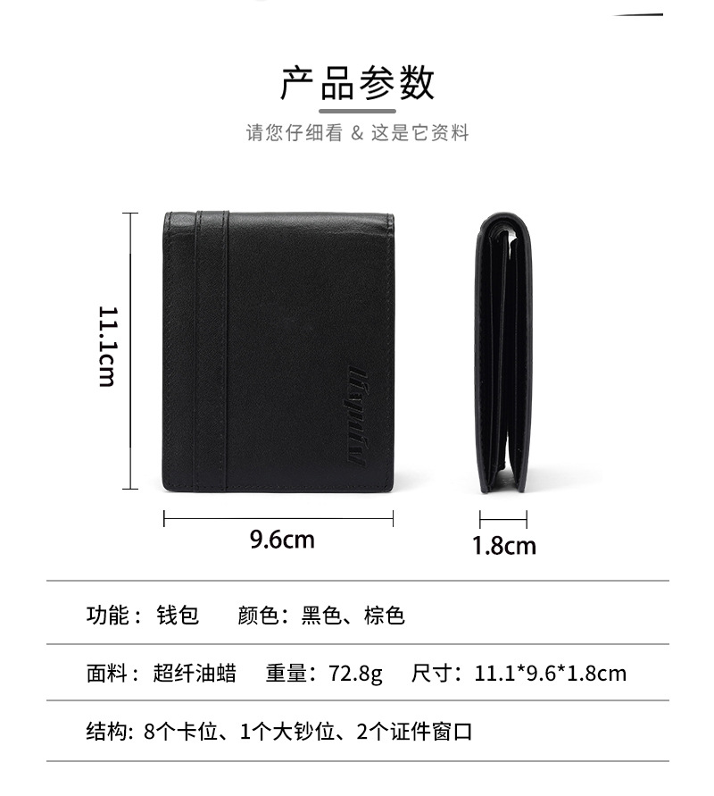 Comercio exterior ligero y delgado, gran capacidad, cartera de tres plegadas, cartera de cuero corta con ventana de identificación, cartera de cuero de vaca de capa superior
