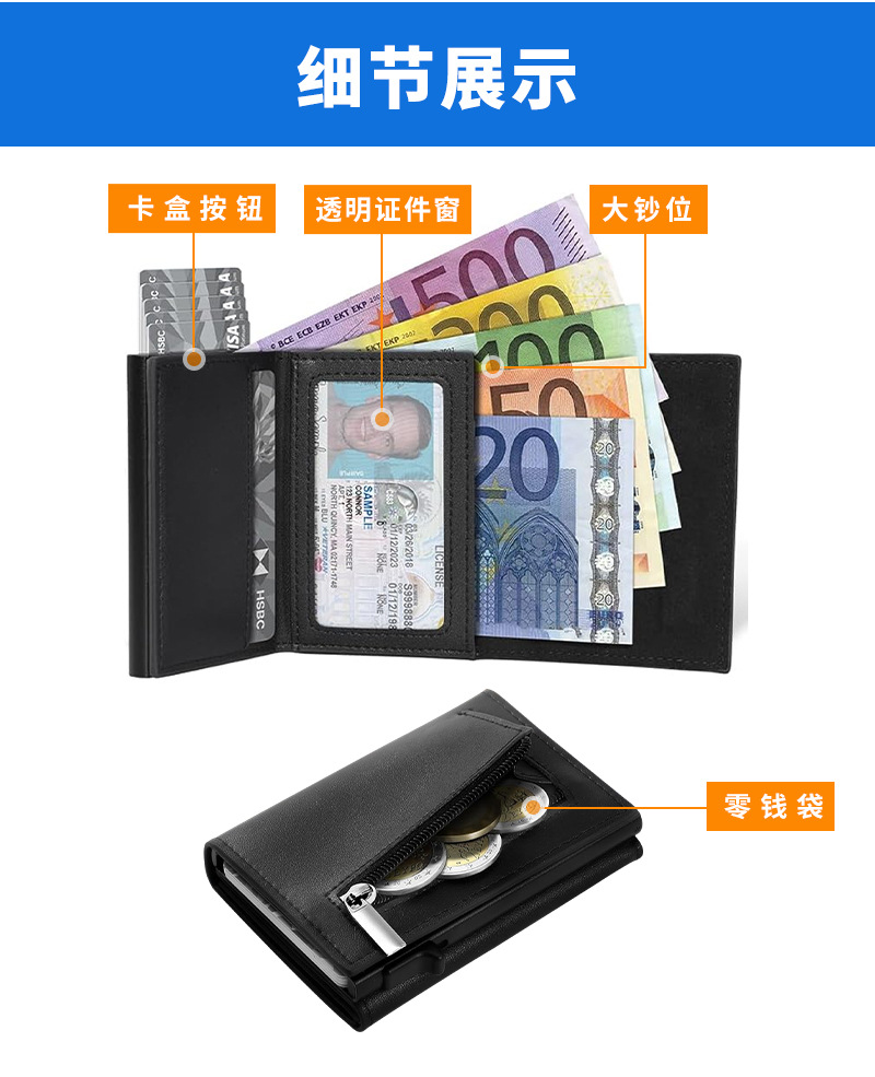 Personalizado cross-border multifuncional RFID antirrobo cartera de control de acceso portátil tarjeta de identificación portable multi-tarjeta cartera para hombres