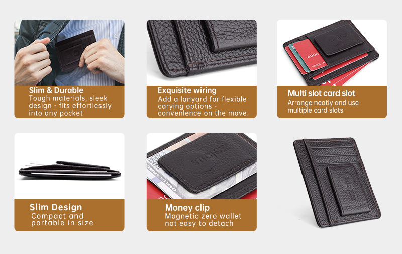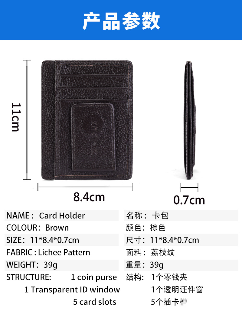 Cartera de cuero ultrafina transfronteriza para hombres, la primera capa de piel de vaca con múltiples tarjetas se puede utilizar como un clip de oro con hebilla de succión de imán RFID