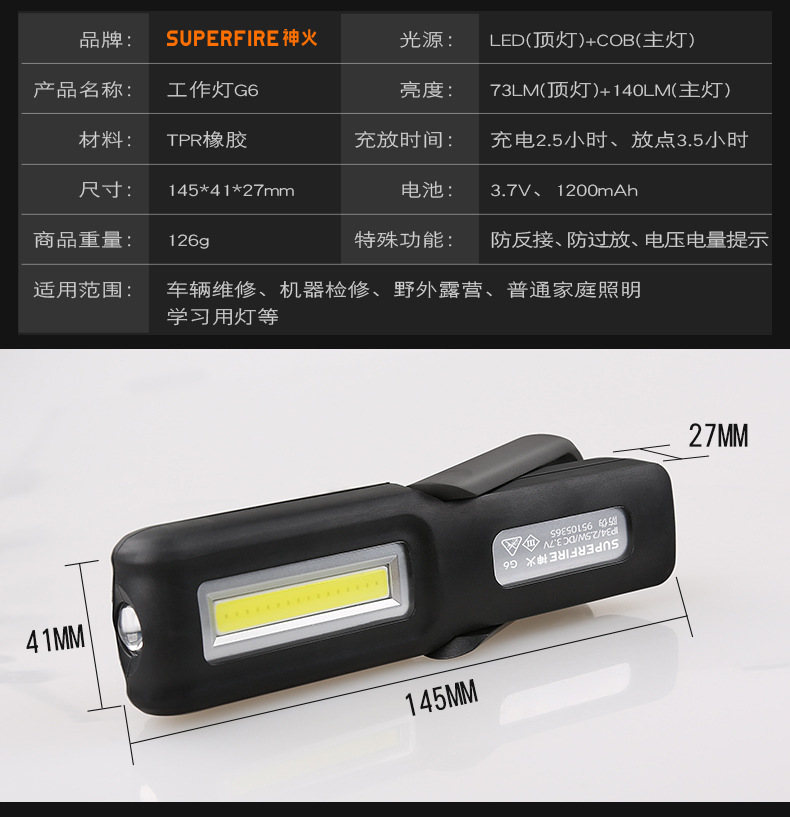 Nueva luz de trabajo multifuncional Luz de emergencia portátil al aire libre Impermeable Larga Resistencia de carga solar de seis engranajes de atenuación