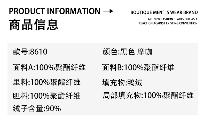 | Color | Y8610 Negro (chaqueta de pluma de alta calidad), Y8610 Moga (chaqueta de pluma de alta calidad) |
