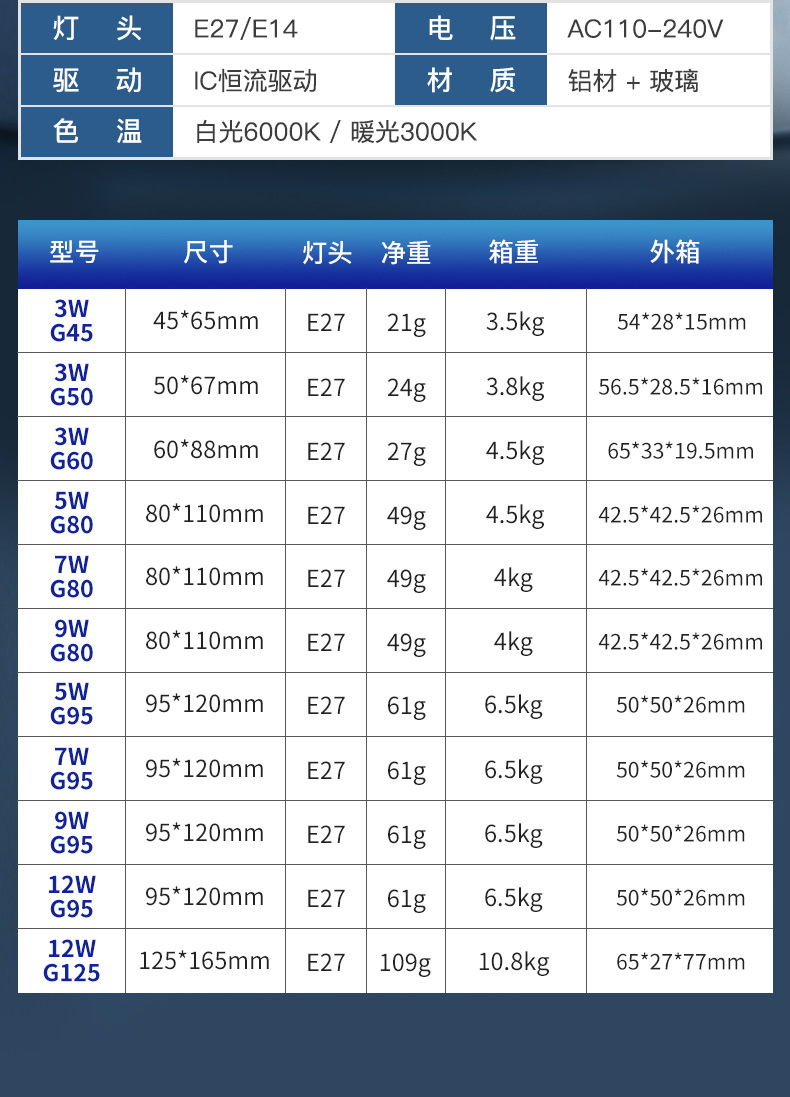 | Potencia | Vidrio de burbuja de bola 3W g45 [puerto de tornillo e27], vidrio de burbuja de bola 3W g45 [puerto de tornillo e14], vidrio de burbuja de bola 3W g50 [puerto de tornillo e27], vidrio de burbuja de bola 3W g50 [puerto de tornillo e14], vidrio de burbuja de bola 5w g60 [puerto de tornillo e27], vidrio de burbuja de bola 7W g80 [puerto de tornillo e27], vidrio de burbuja de bola 9w g95 [puerto de tornillo e27], vidrio de burbuja de bola 12w g125 [puerto de tornillo e27] |