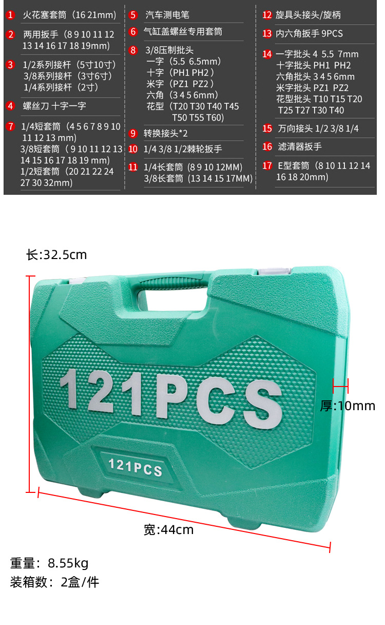 741, juego de herramientas de reparación de automóviles de 121 piezas con 24 dientes (caja verde), 3/pieza