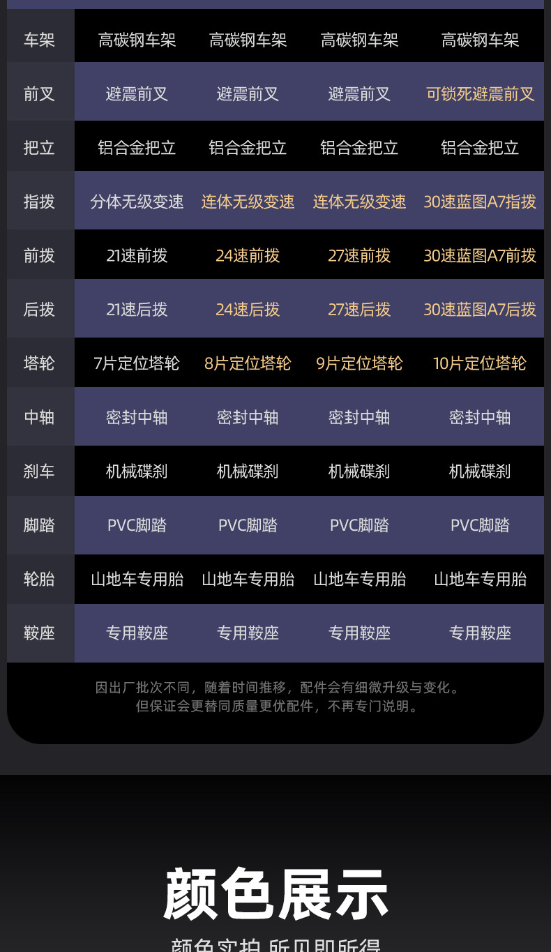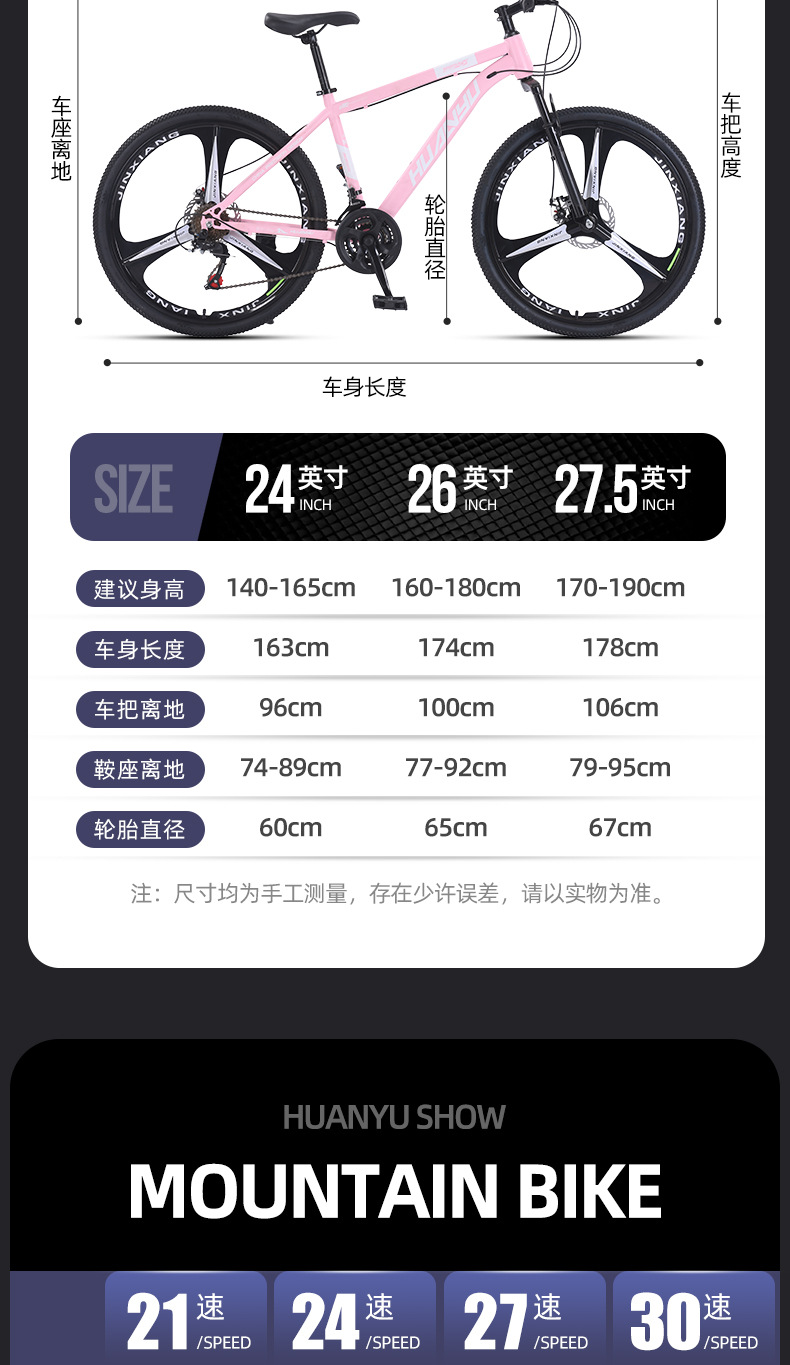 | Tamaño | 24 pulgadas - 21, 24 pulgadas - 24, 24 pulgadas - 27, 24 pulgadas - 30, 26 pulgadas - 21, 26 pulgadas - 24, 26 pulgadas - 27, 26 pulgadas - 30, 27,5 pulgadas - 21, 27,5 pulgadas - 24, 27,5 pulgadas - 27, 27,5 pulgadas - 30 |
